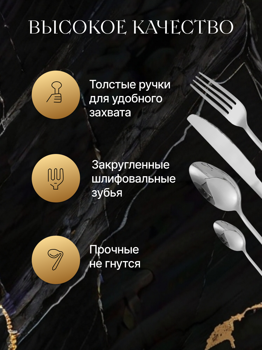 | В набор входит | вилки 6 шт., ножи 6шт., большие ложки 6 шт. и чайные ложки 6 шт. |