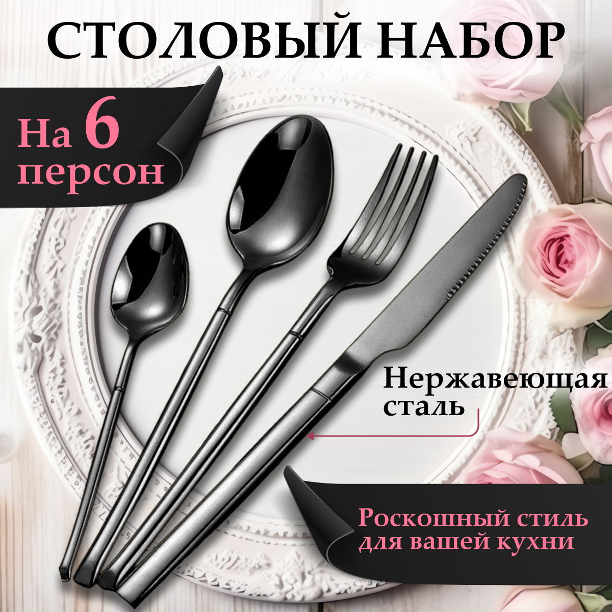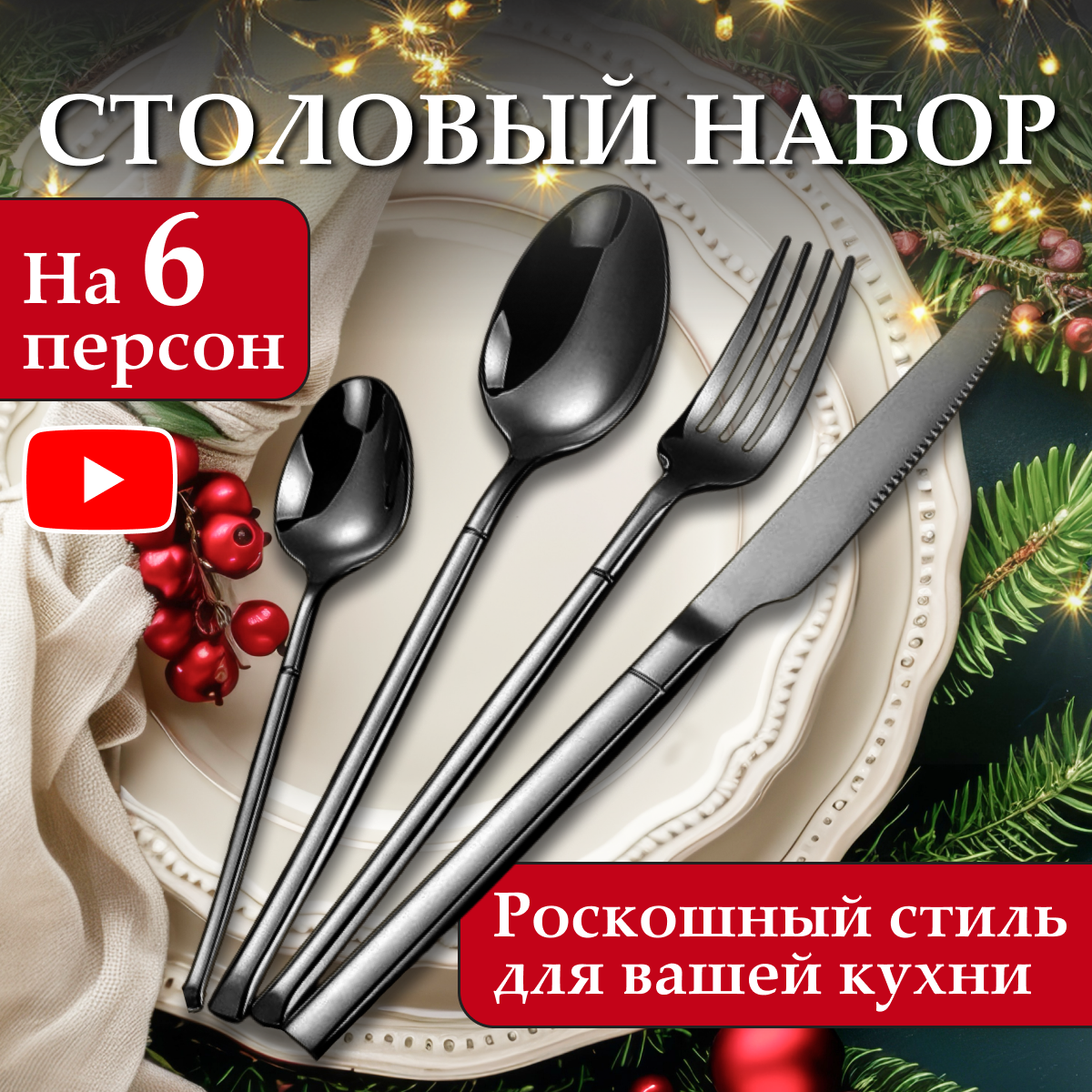 Набор столовых приборов на 6 персон черный глянцевый, из нержавеющей стали, 24 предмета интересное: