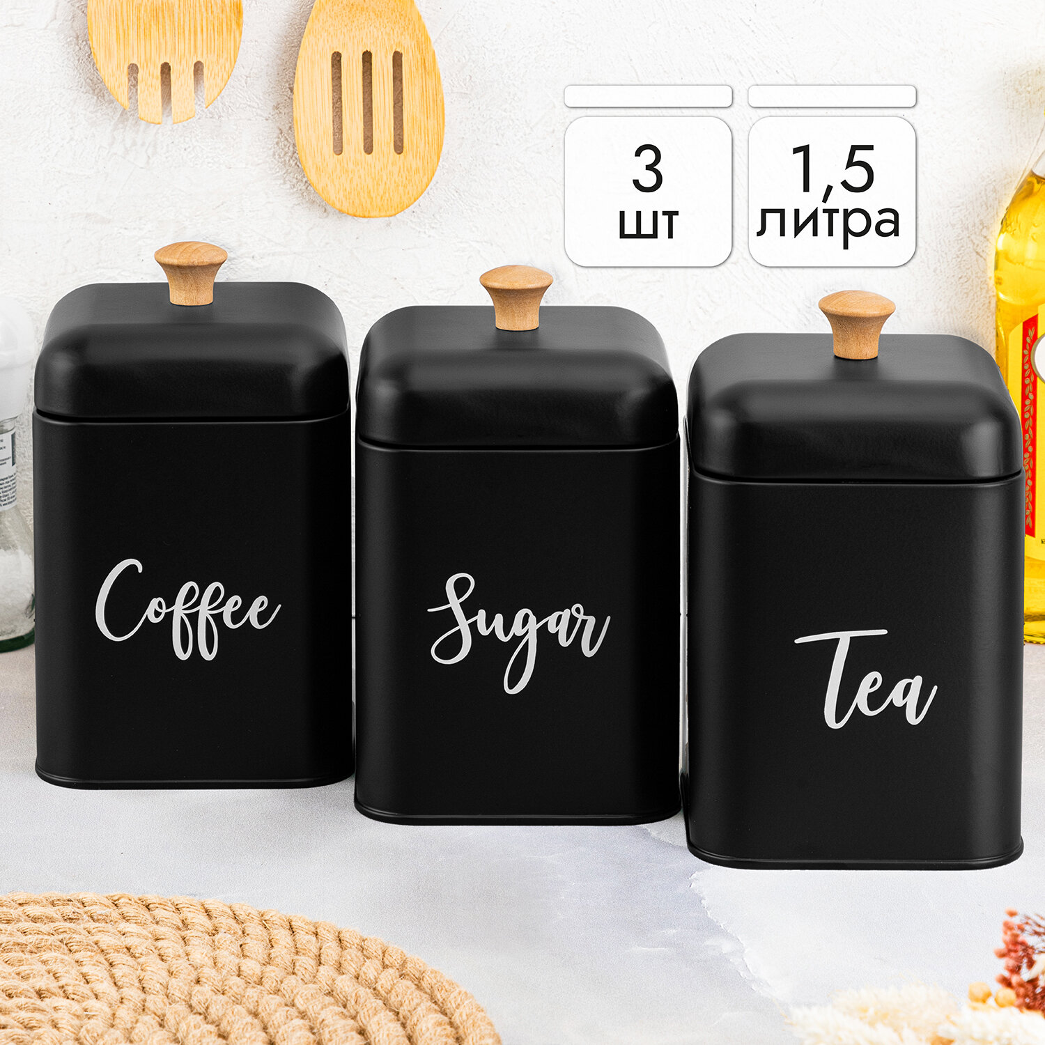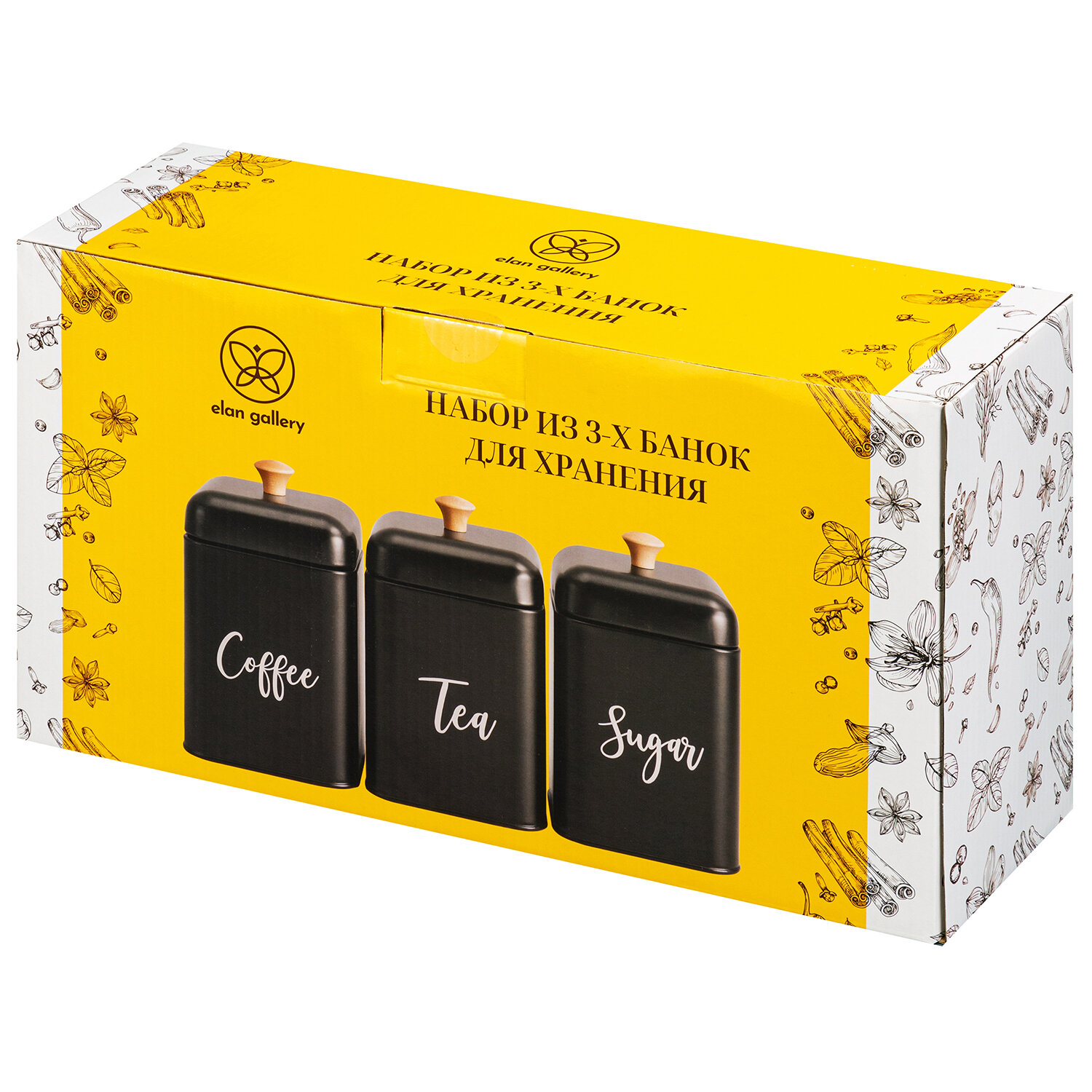 Банка для хранения сыпучих продуктов/ чая, кофе, сахара 3 шт 1,5 л Elan Gallery"Tea, coffee, sugar" с крышками, черный, набор