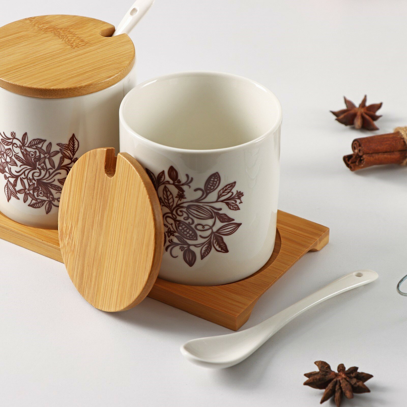 Набор банок фарфоровых для сыпучих продуктов с ложками на деревянной подставке Доляна «Эстет. Весна», 3 предмета: 240 мл, цвет белый