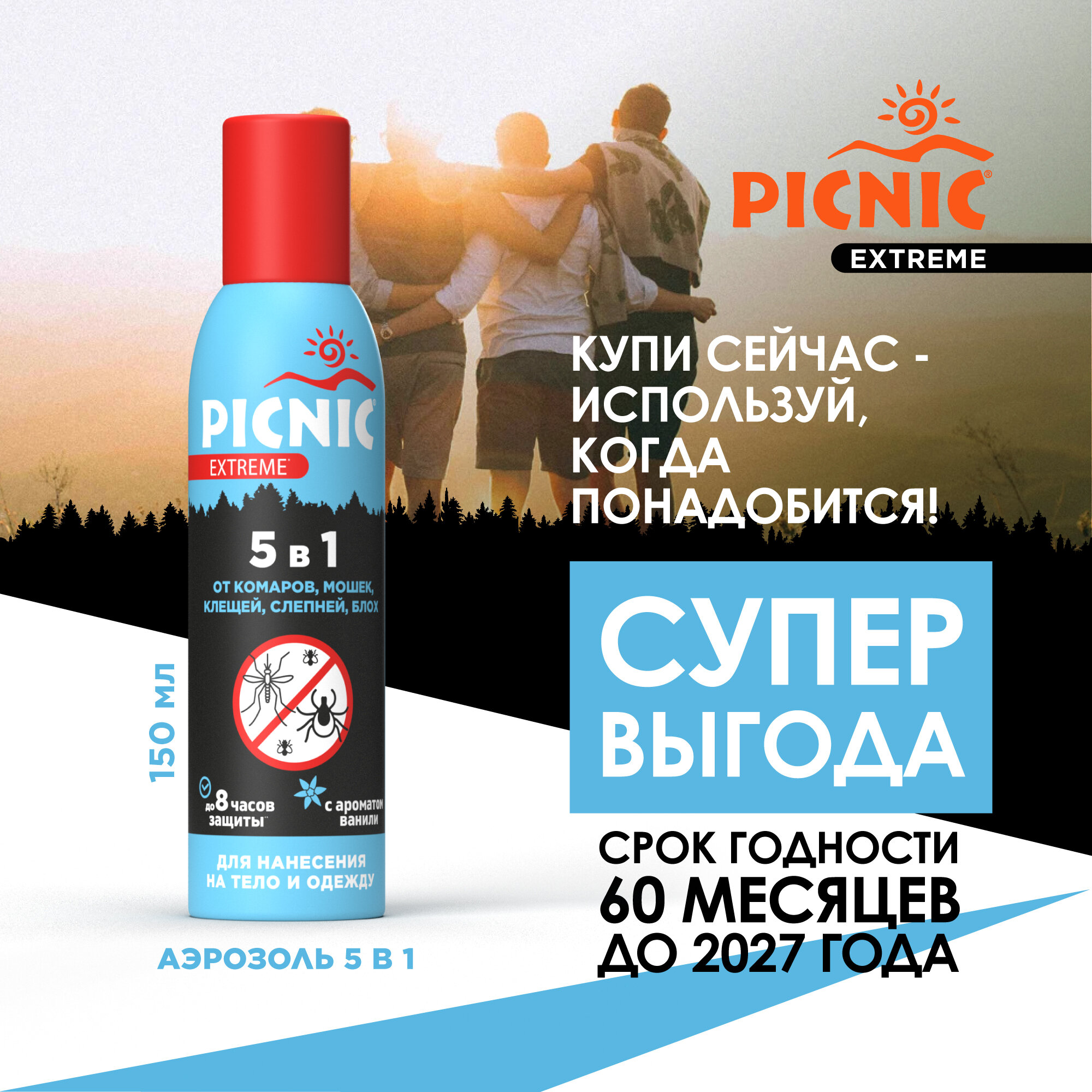 Купить Аэрозоль Picnic Extreme 5 в 1 от Комаров, Мошки, Клещей, Слепней, Блох 150мл