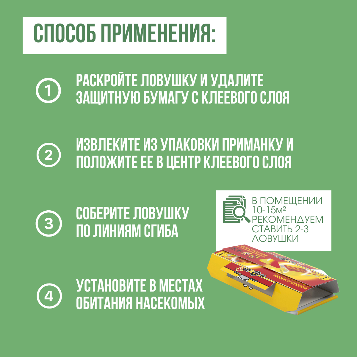 | Способ применения | извлечь ловушку из упаковки, удалить защитную бумагу с клеевого слоя, освободить таблетку привлекателя из блистера и поместить ее в центр ловушки, прижав к к клеевому слою. Сложить боковые части ловушки "домиком". Разместить ловушку в местах обитания и скопления тараканов или муравьев: на кухне, в ванной комнате, в жилых помещениях под раковиной, около емкостей для сбора мусора, за холодильником, вдоль отопительной и водопроводной систем, под мебелью и т. д. Если насекомые отлавливаются плохо, ловушку следует переместить в другое посещаемое ими место. Беречь от попадания влаги! |