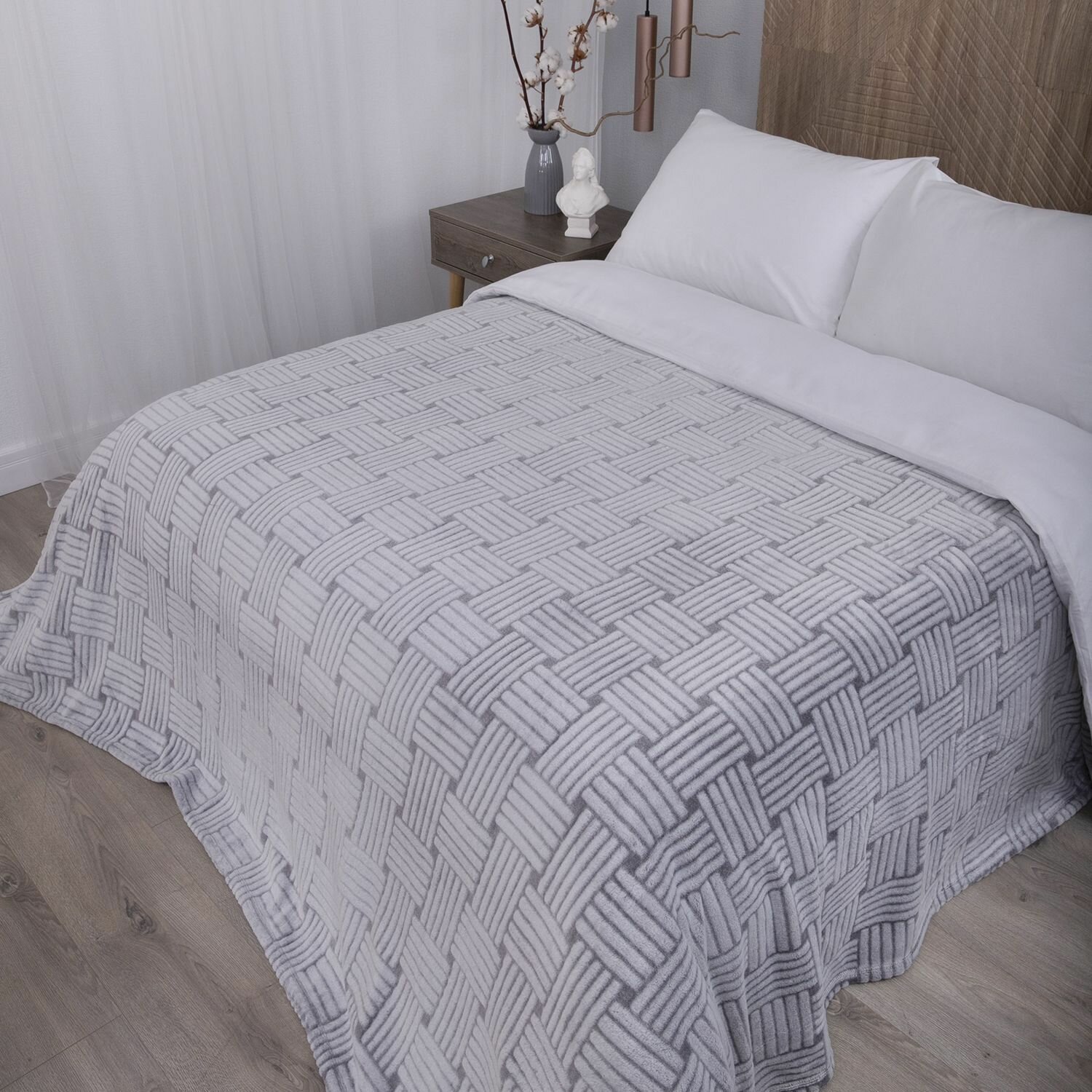 Плед 180Х200 см на кровать или диван. Плюшевый и мягкий "Жаккард" серый