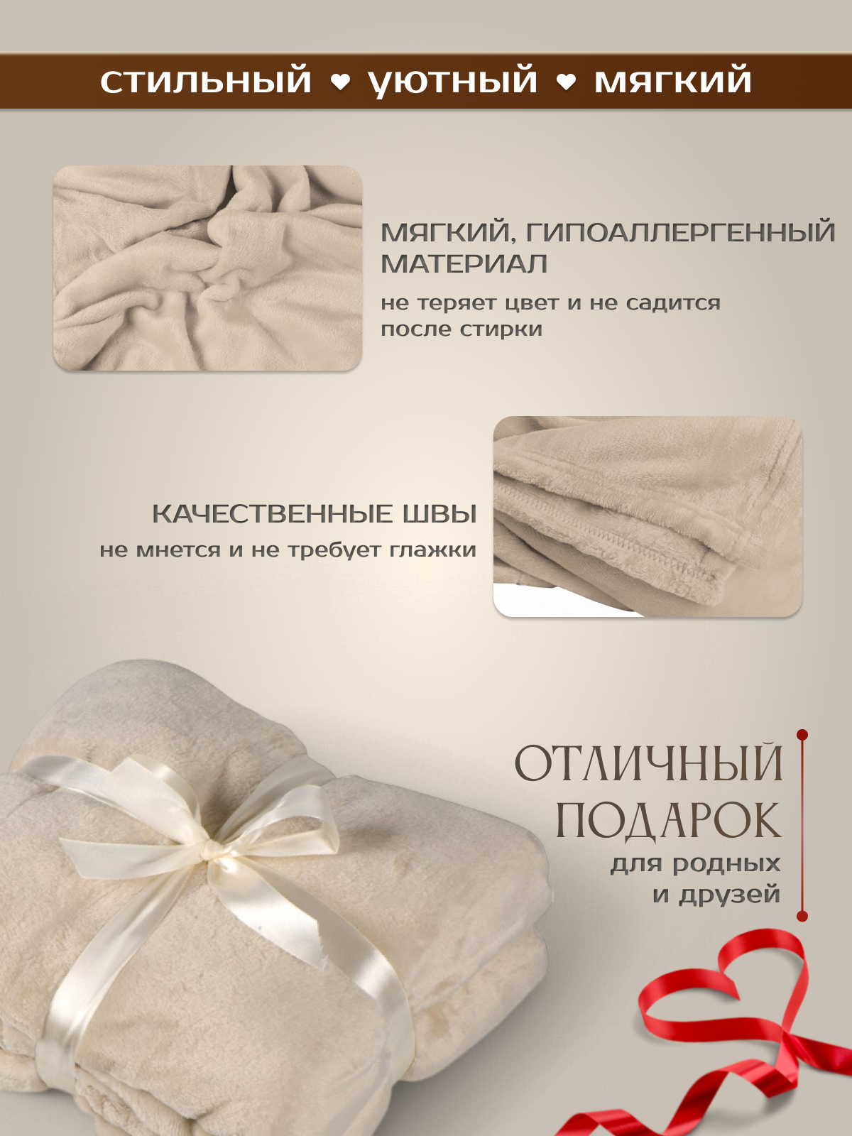| Подробная комплектация | Плед, атласная лента 172±5 х 2,5 см + полиэтиленовый пакет |