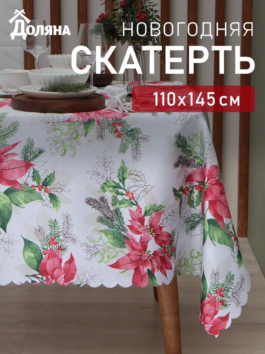Новый год. Скатерть новогодняя Доляна "Рождественские цветы" 145*220 см, 100% п/э