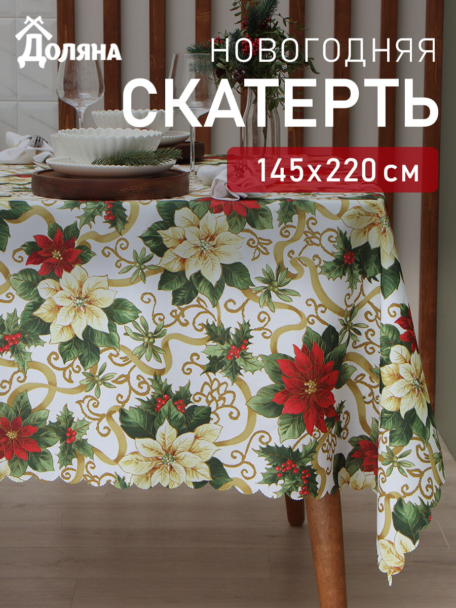 Новый год. Скатерть новогодняя Доляна "Рождественские цветы" 145*220 см, 100% п/э