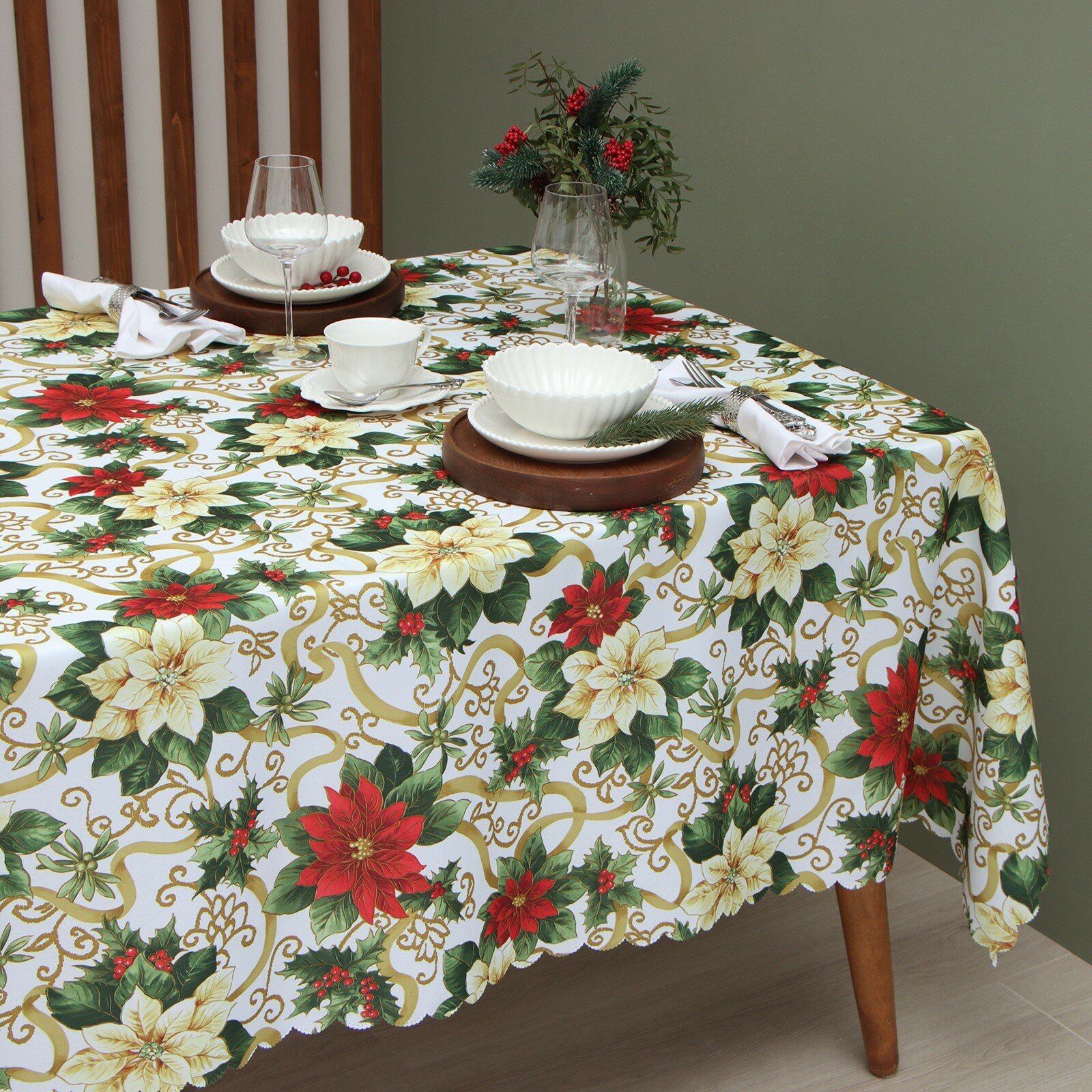Скатерть новогодняя "Рождественские цветы" 145*220 см, 100% п/э