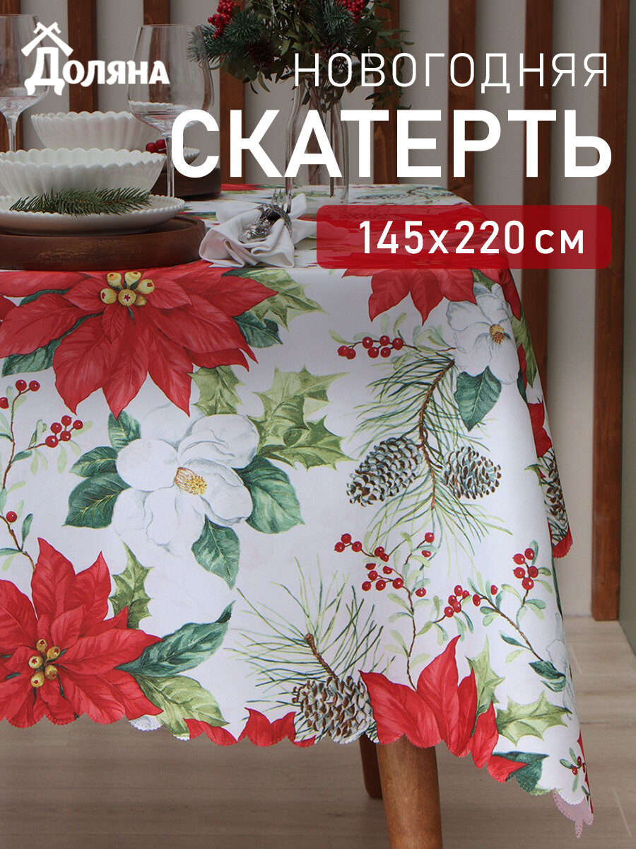 Новый год. Скатерть новогодняя Доляна "Рождественские цветы" 145*220 см, 100% п/э
