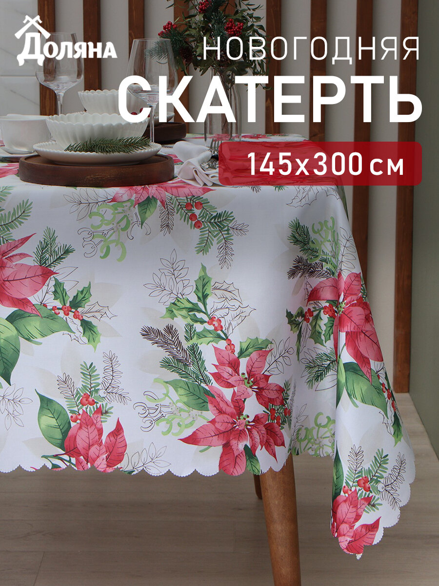 Новый год. Скатерть новогодняя Доляна "Рождественские цветы" 145*300 см, 100% п/э