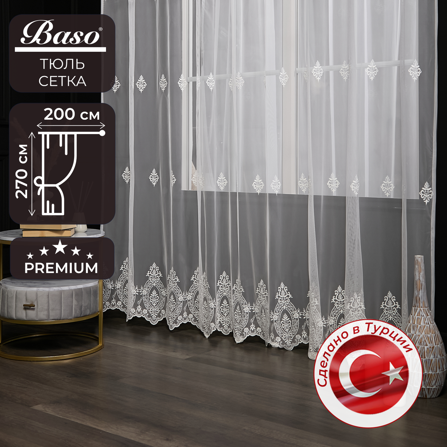 Тюль сетка Baso на шторной ленте с вышивкой / для интерьера гостиной, спальни, кухни, дом, дача / 270х200 см., 1 шт., белый, Турция