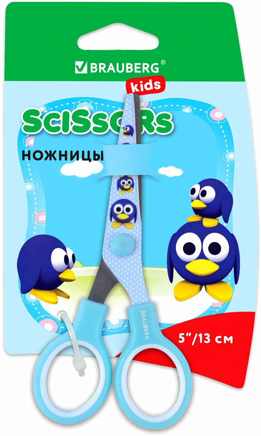 Купить Ножницы канцелярские BRAUBERG "Kid Series", 130 мм, голубые, с цветной печатью "Пингвины", закругленные