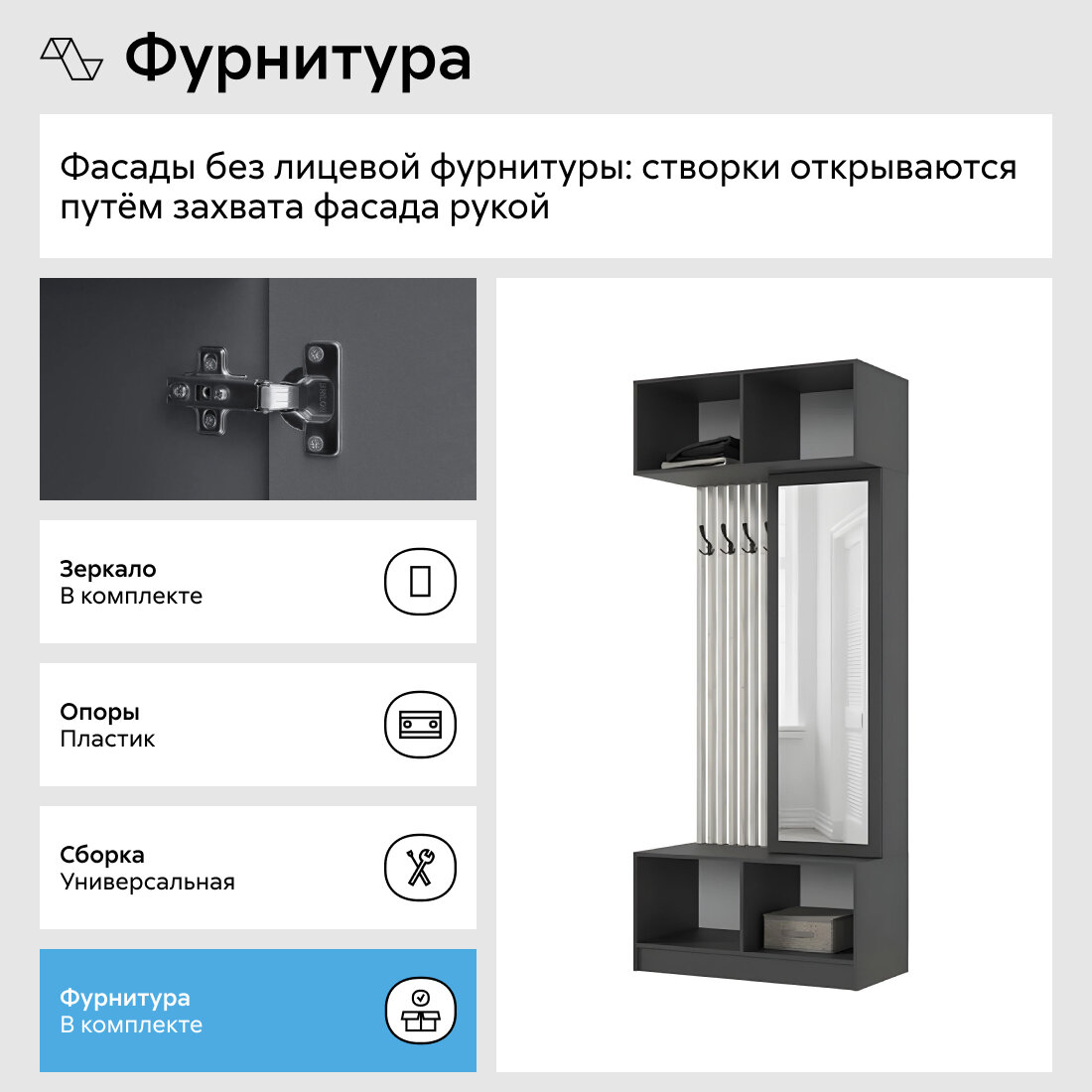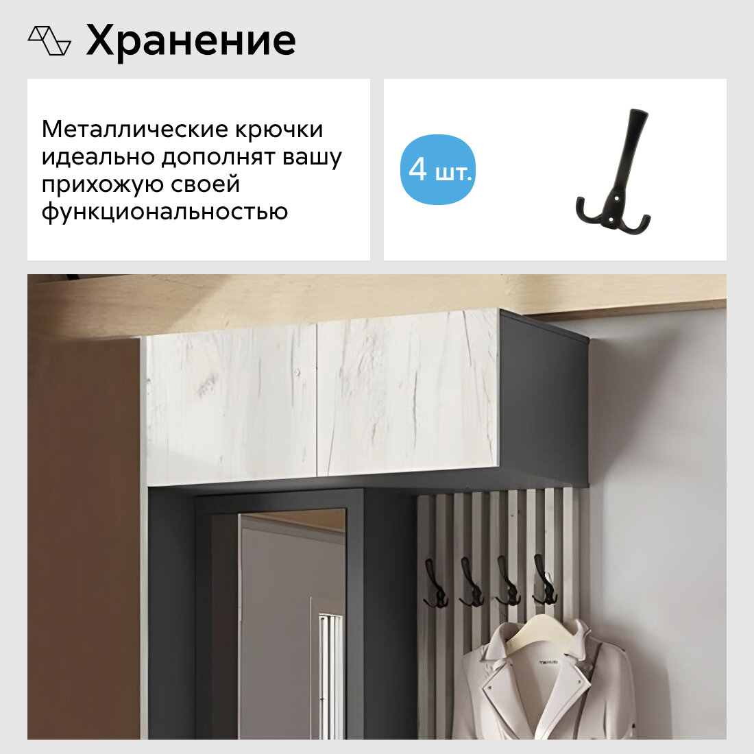 | Состав комплекта | Прихожая / зеркало / крючки. |