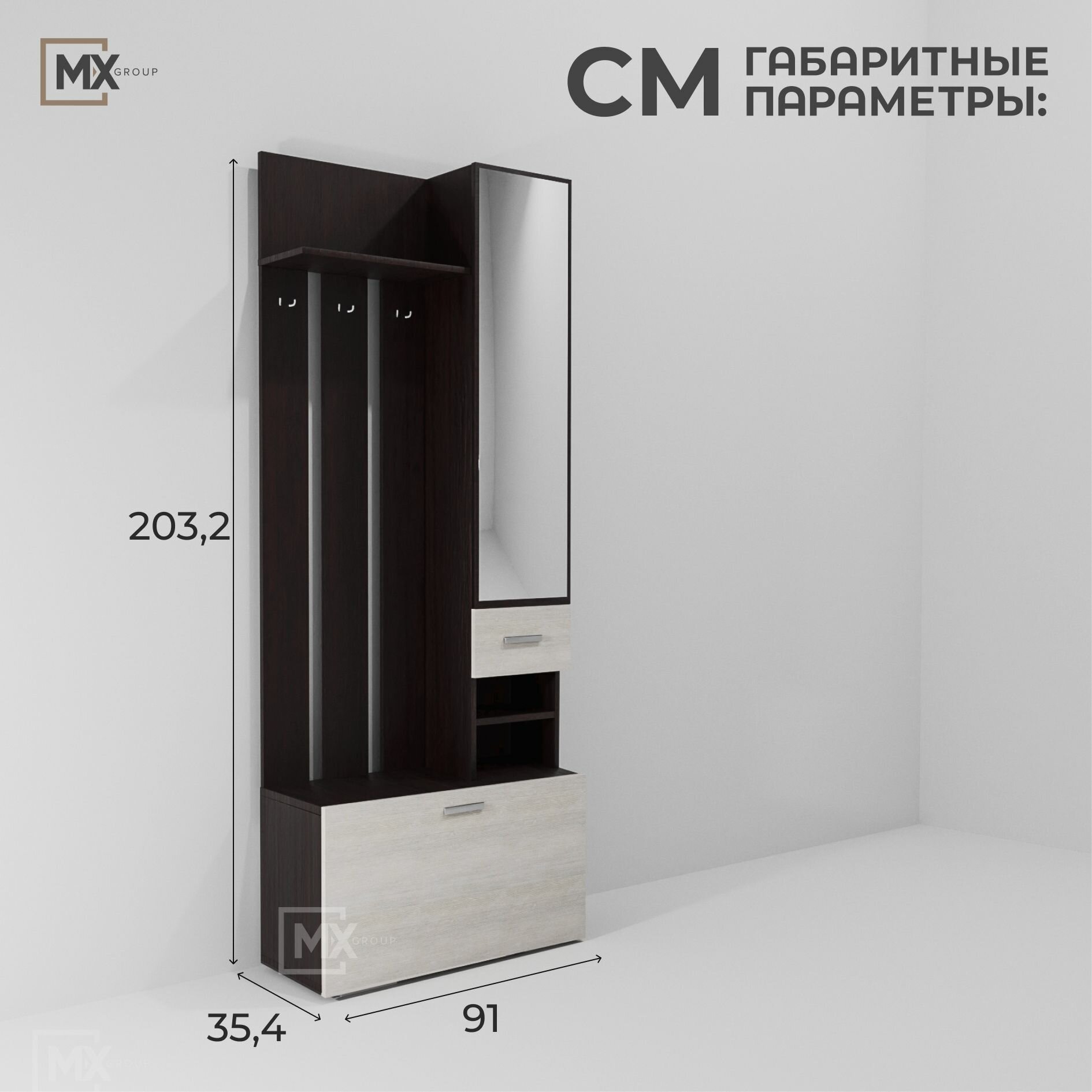 Прихожая Ника ВЗ910, Дуб Венге/Сосна Лоредо, ЛДСП, с тумбой, вешалкой, полкой, зеркалом, 910х2032х354, Эра