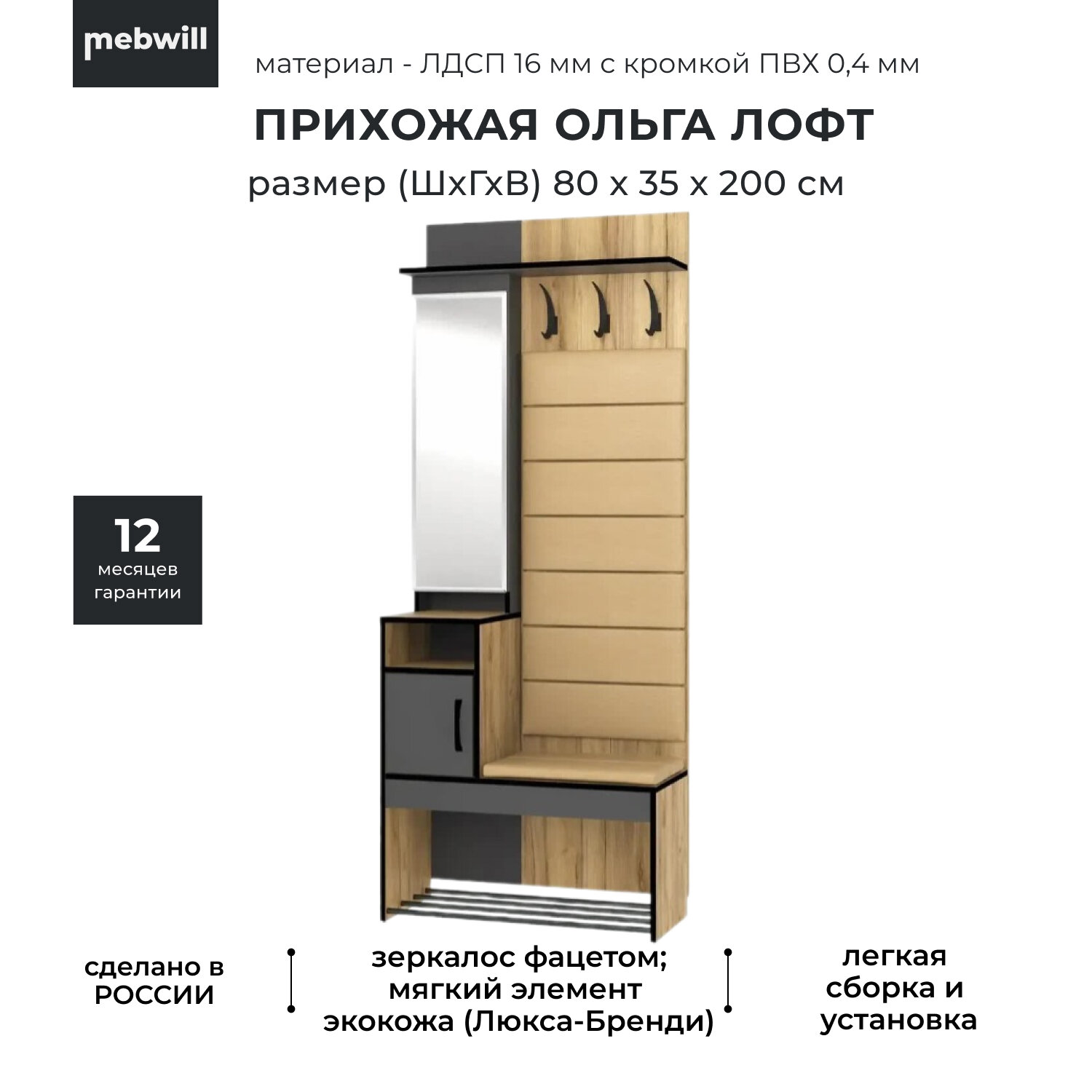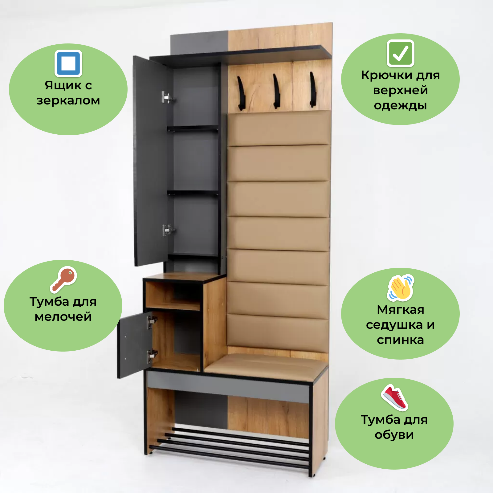 | Особенности | для маленькой прихожей, для узкой прихожей, модульная конструкция, мягкое сиденье, с доводчиками, с местом для сидения, со штангой для вешалок, шкаф с зеркалом |