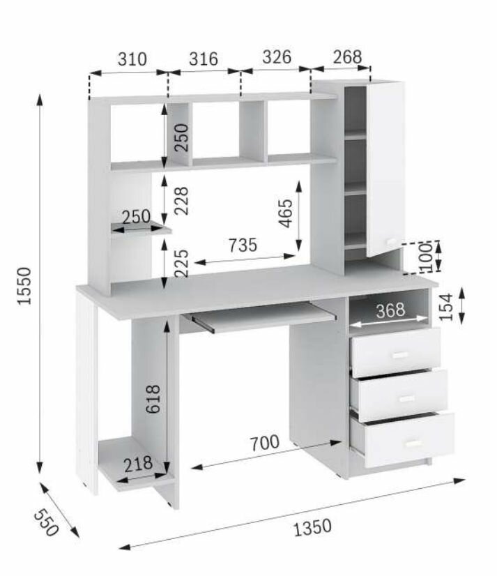 | Дополнительная информация | Компактный и удобный домашний офис — стол КС-003Компьютерный и письменный стол в одном комплексе понравится и студентам, и сотрудникам на дистанционном режиме.Ниша под монитор 735х465 ммРучка пластикНаправляющие роликовыеУниверсальная (зеркальная) сборка конструкцией не предусмотренаФасад открывается исключительно слева направоШирина 1350 ммВысота 1550 ммГлубина 550 ммМатериал корпуса ЛДСПМатериал фасада ЛДСПЦвет: Белый/серый |