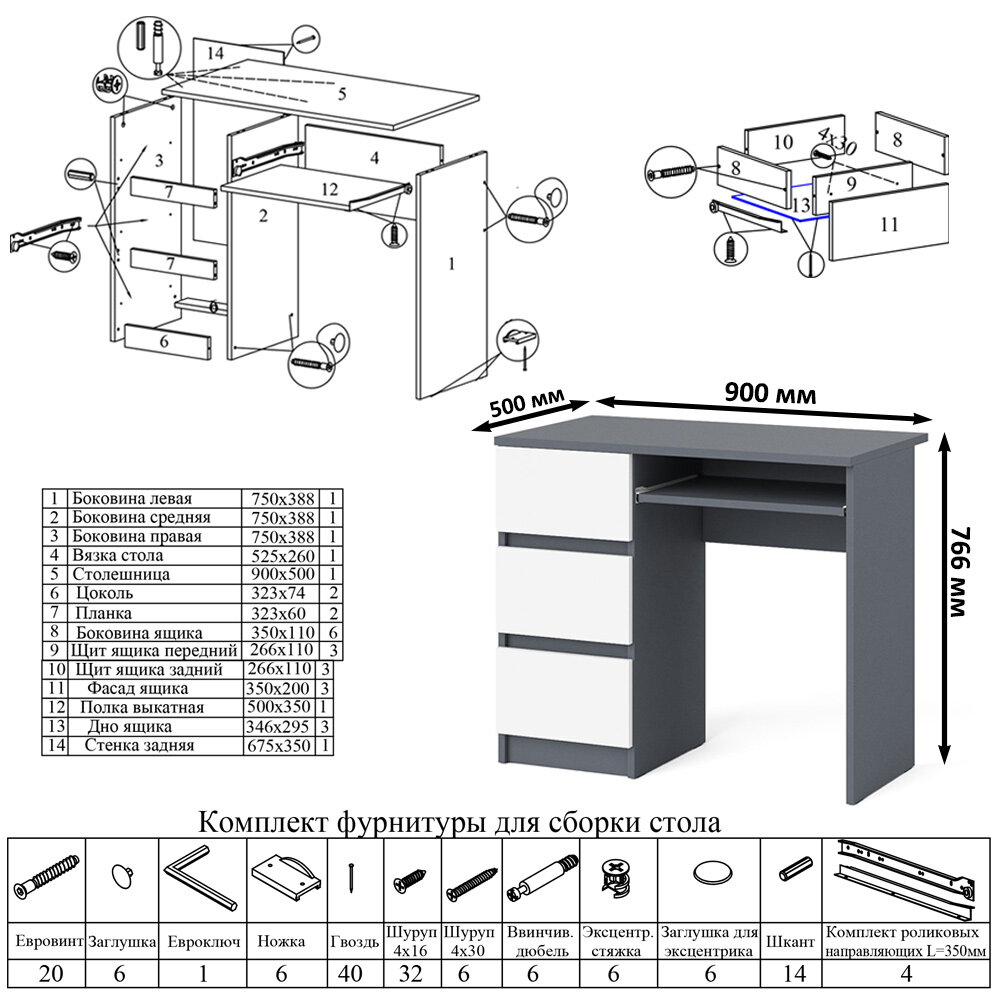 СохранитьСтол компьютерный три ящика Мори МС-6 левый цвет графит/белый, ШхГхВ 90х50х76,6 см, ящики слева, НЕ универсальная сборка интересное: