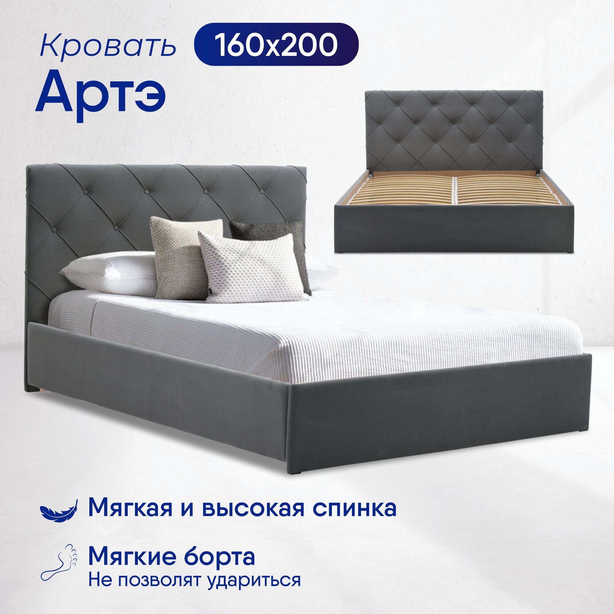 Двуспальная кровать Артэ 160х200, с мягким изголовьем для дома и спальни, Ладья, ортопедическое основание, Amigo Grey