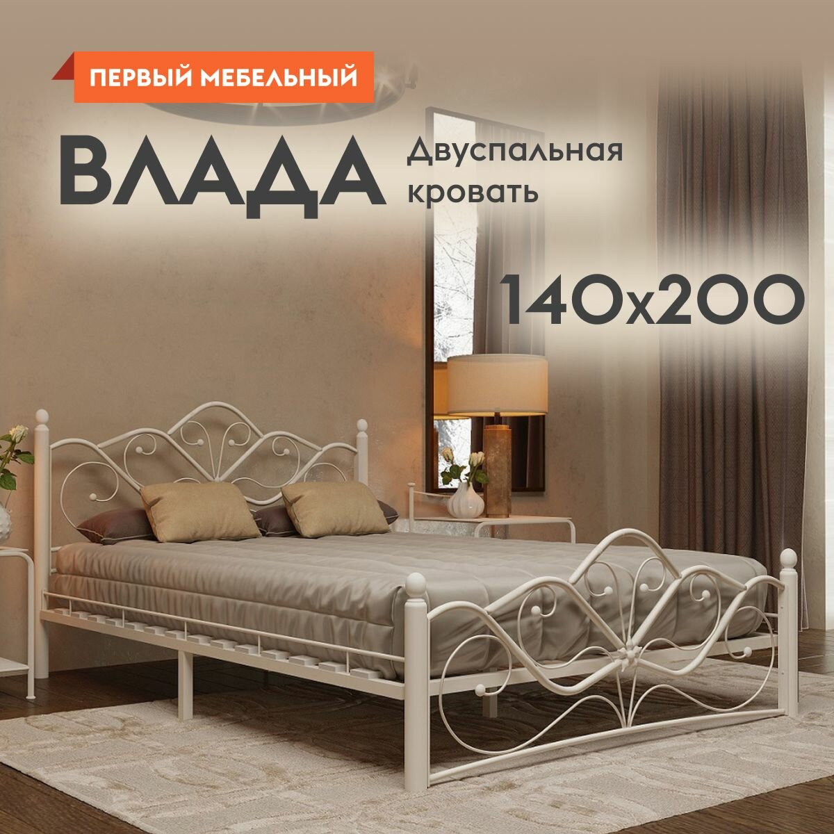 Кровать двуспальная металлическая кровать Влада 140х200 см, с анатомическим основанием, Кремово-белый металл
