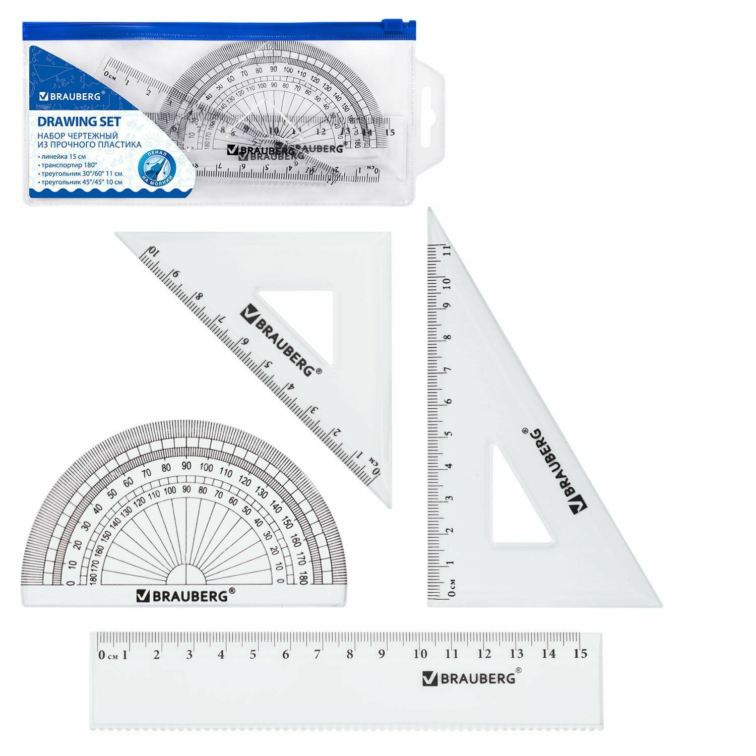 Набор чертежный малый BRAUBERG (линейка 15 см, 2 угольника, транспортир), конверт на молнии, 210306 - 1 шт.