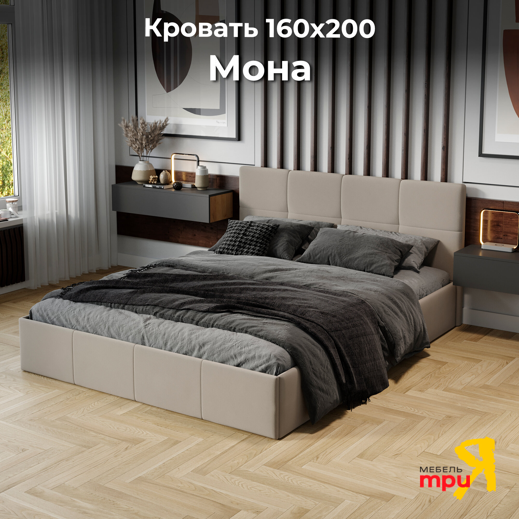 Кровать двуспальная ТриЯ 160х200 с подъемным механизмом, Мона, Велюр Confetti Stone