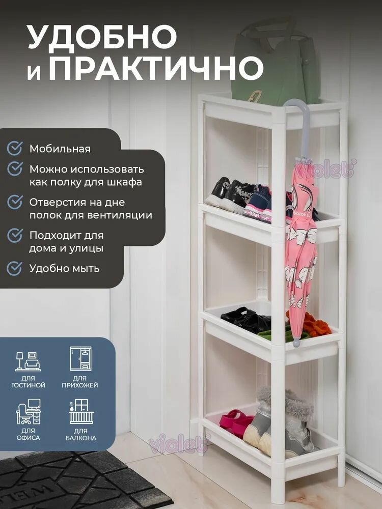 Купить Этажерка Violet для хранения 4х ярусная VIKEA широкая, цвет белый / стеллаж для кухни и ванной