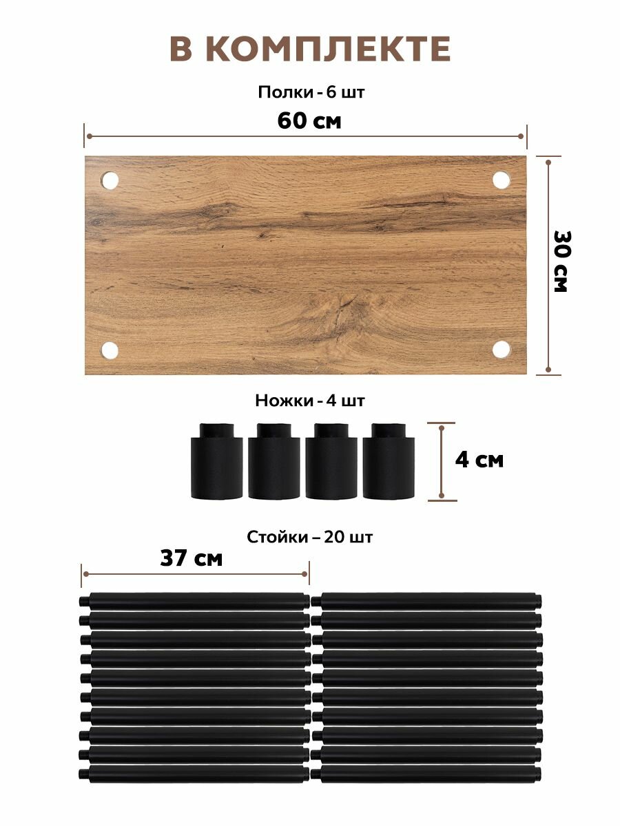 | Дополнительная информация | полка ЛДСП с 4 футорками - 1 шт. полка ЛДСП с 4 отверстиями -5 шт стойка пластиковая -20 шт ножки пластиковые -4 шт инструкция по сборке - 1 шт |