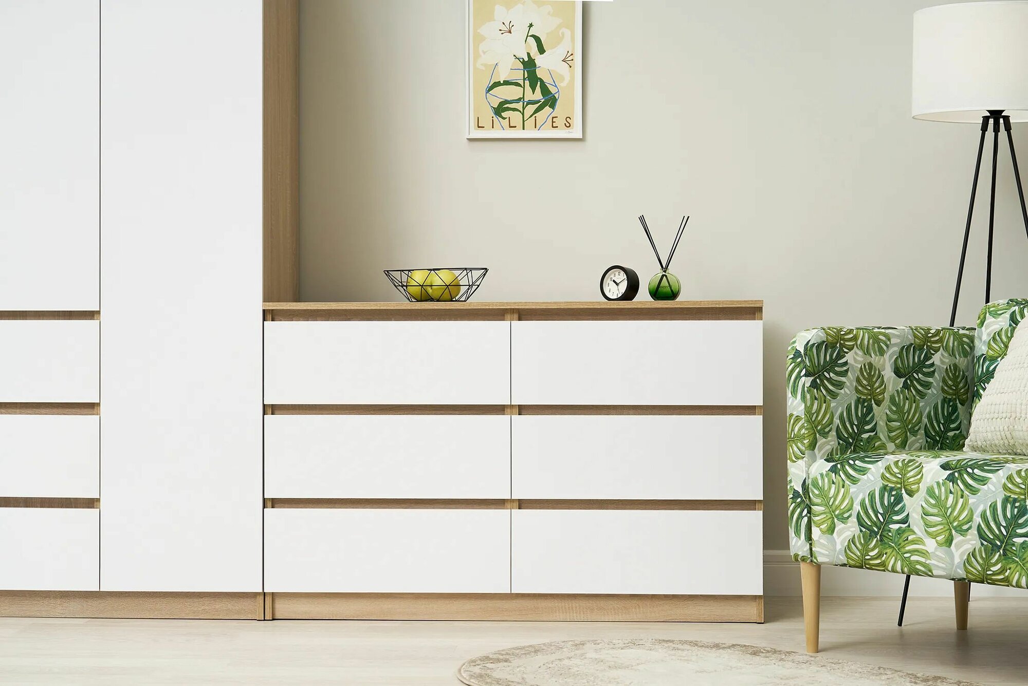Комод для одежды в спальню Нонтон Челси, белый глянец / дуб сонома, 120х45х76.8 см