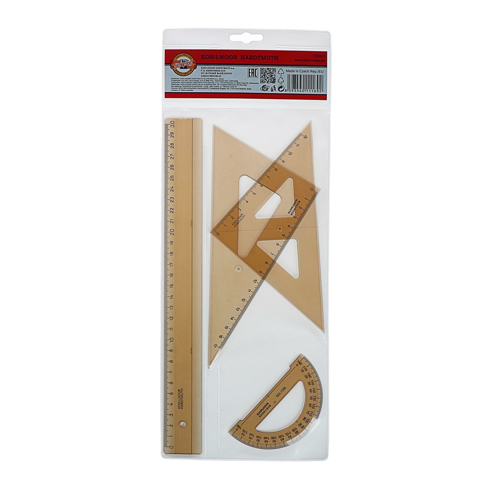 Геометрический набор средний ,в набор входят: линейка 30 см, два угольника, транспортир, Koh-i-noor