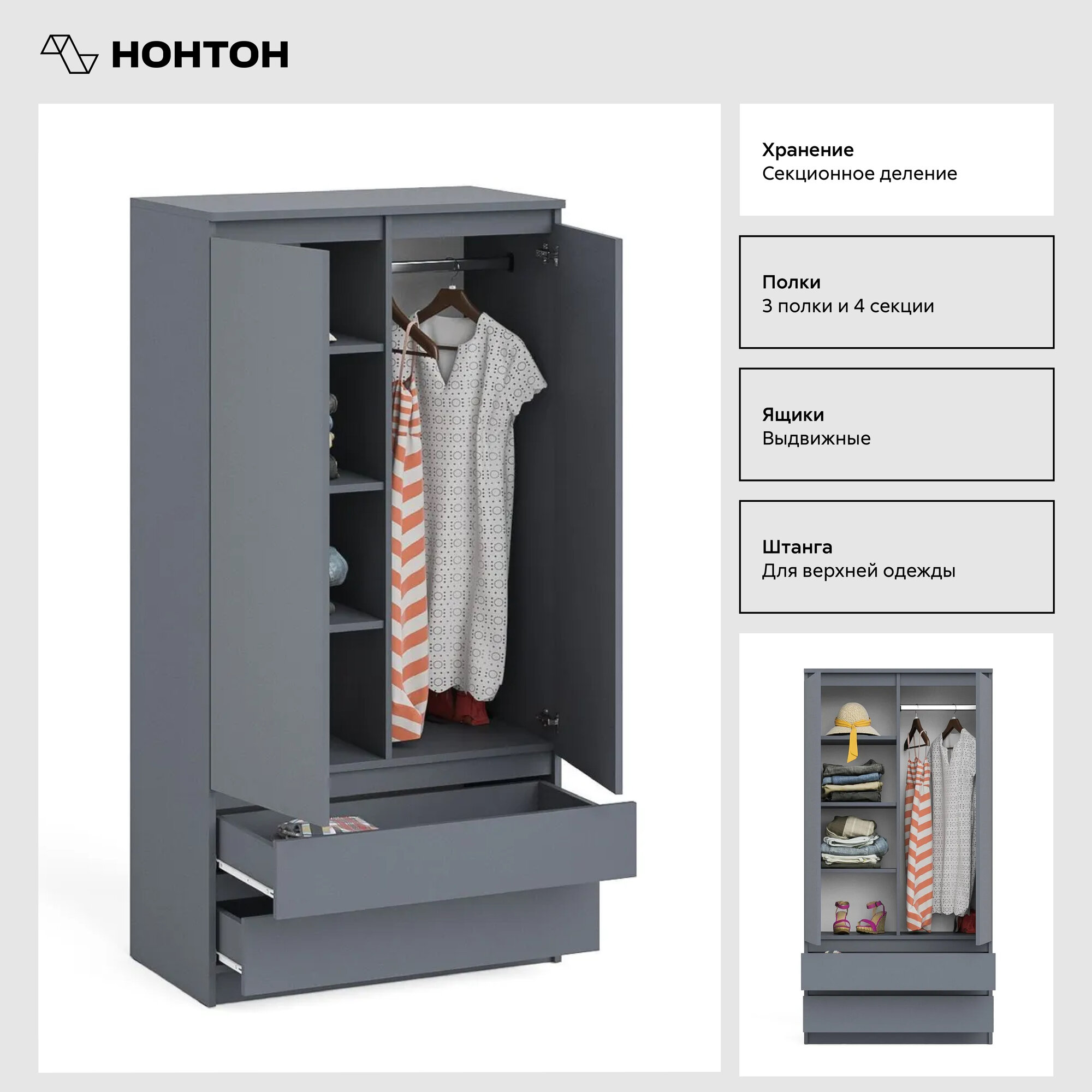 Шкаф для одежды распашной Нонтон Челси, графит, 160 см, с тремя ящиками