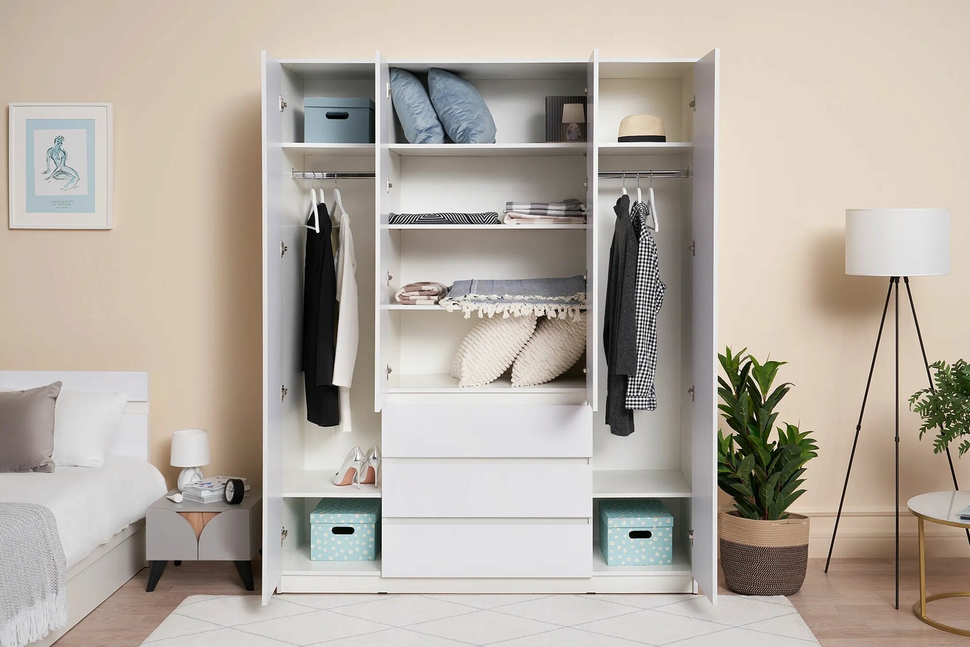 Купить Шкаф 4-х створчатый распашной с ящиками и антресолью "Челси" 1,6 Белый/Белый Глянец