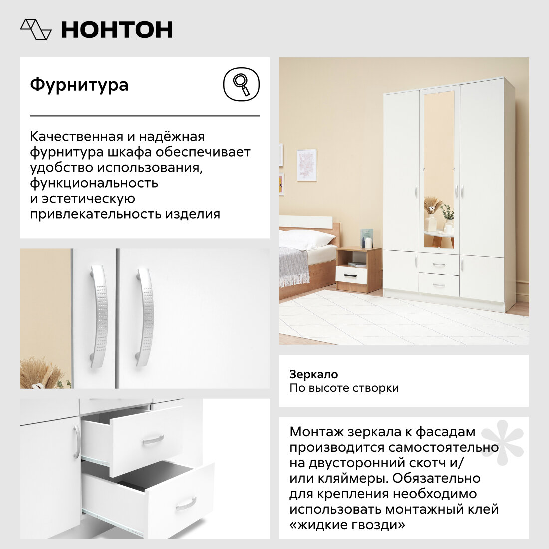 | Комплектация | Шкаф 1 шт. Шкаф комплектуется горизонтальной штангой. Зеркало 4 мм. |