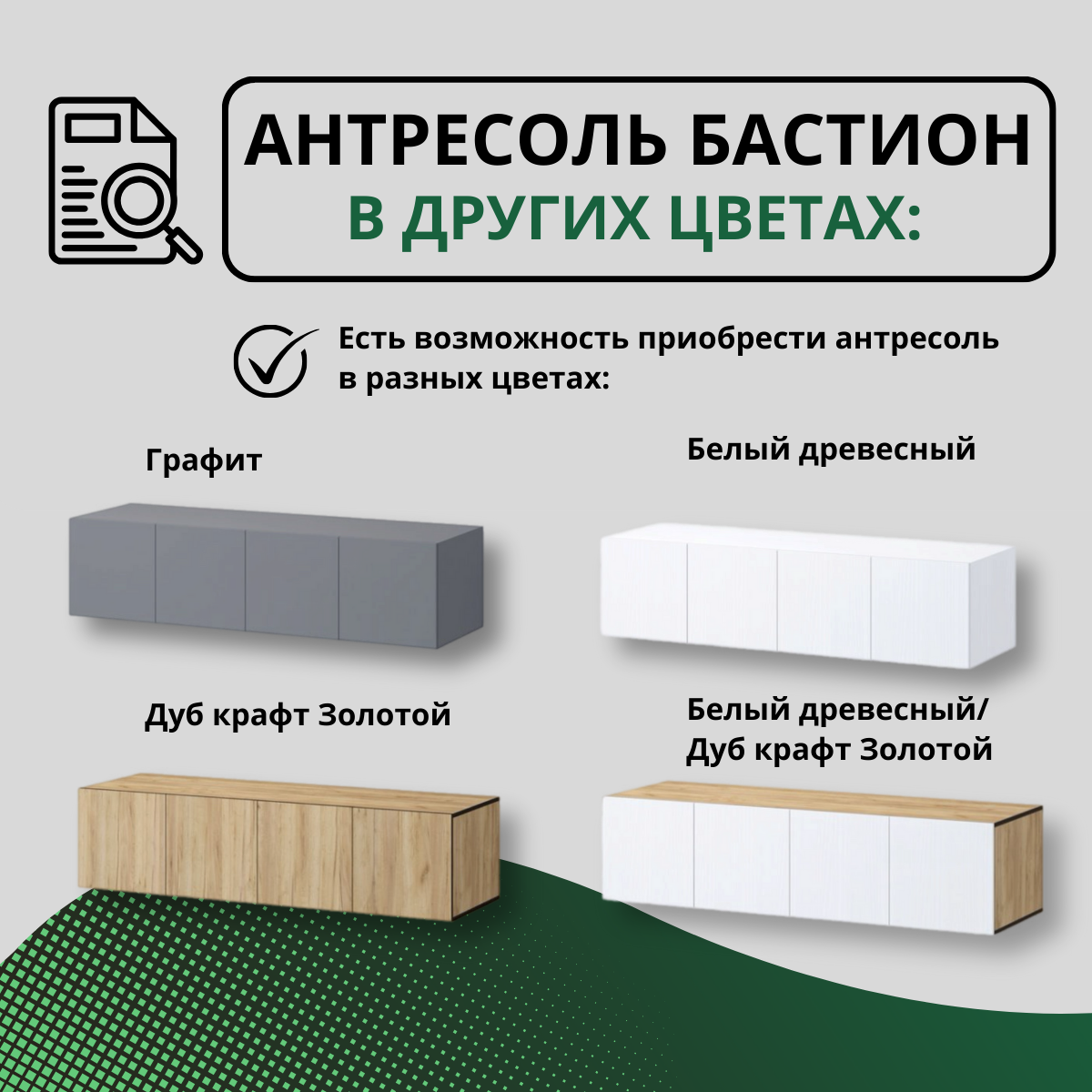 | Комплектация | антресоль с дверками без ручек, механизм нажимной |