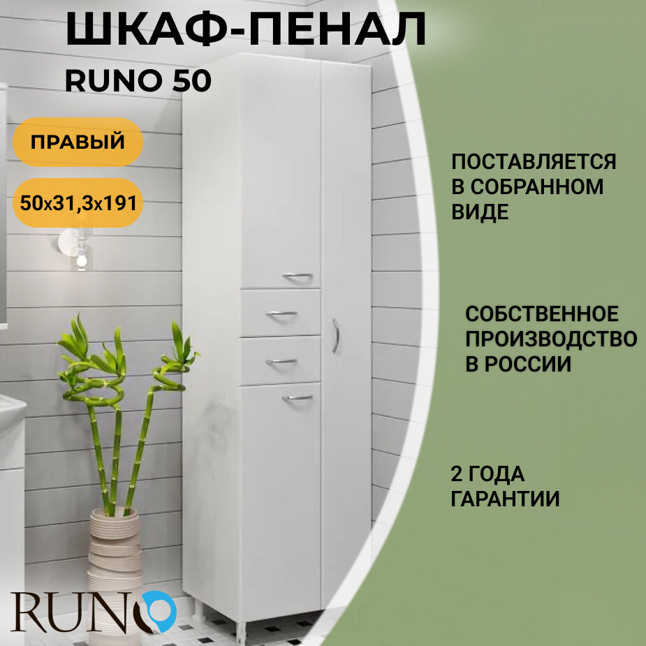 Купить Шкаф в ванную пенал напольный Руно 50, правый, белый