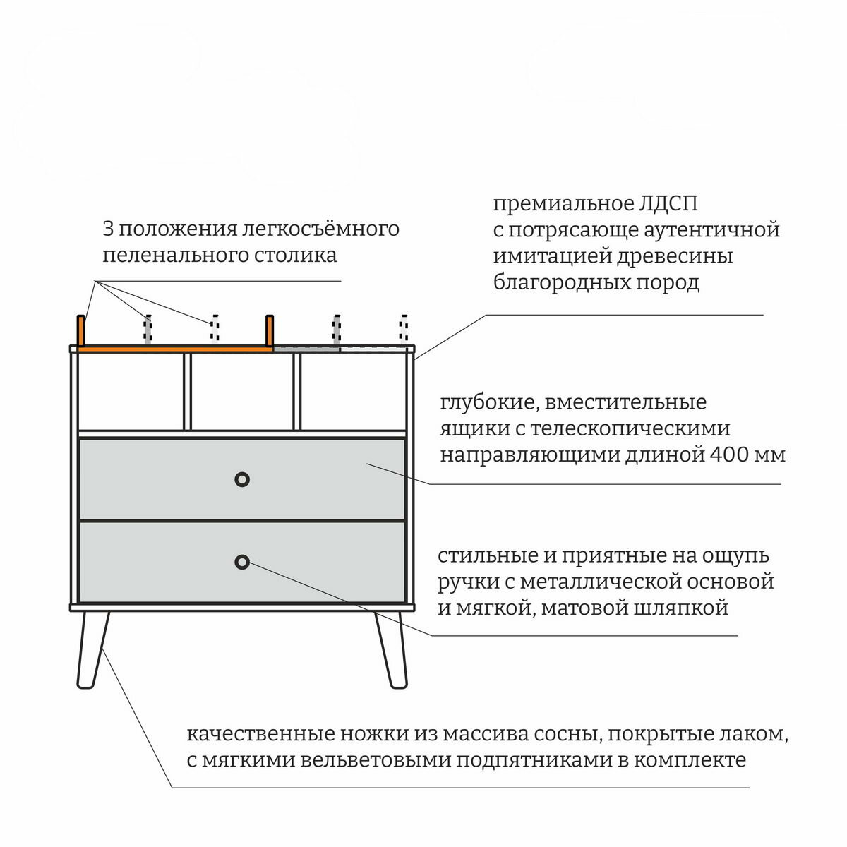 | Дополнительная информация | 3 положения съёмного пеленального столика, телескопические направляющие ящиков |