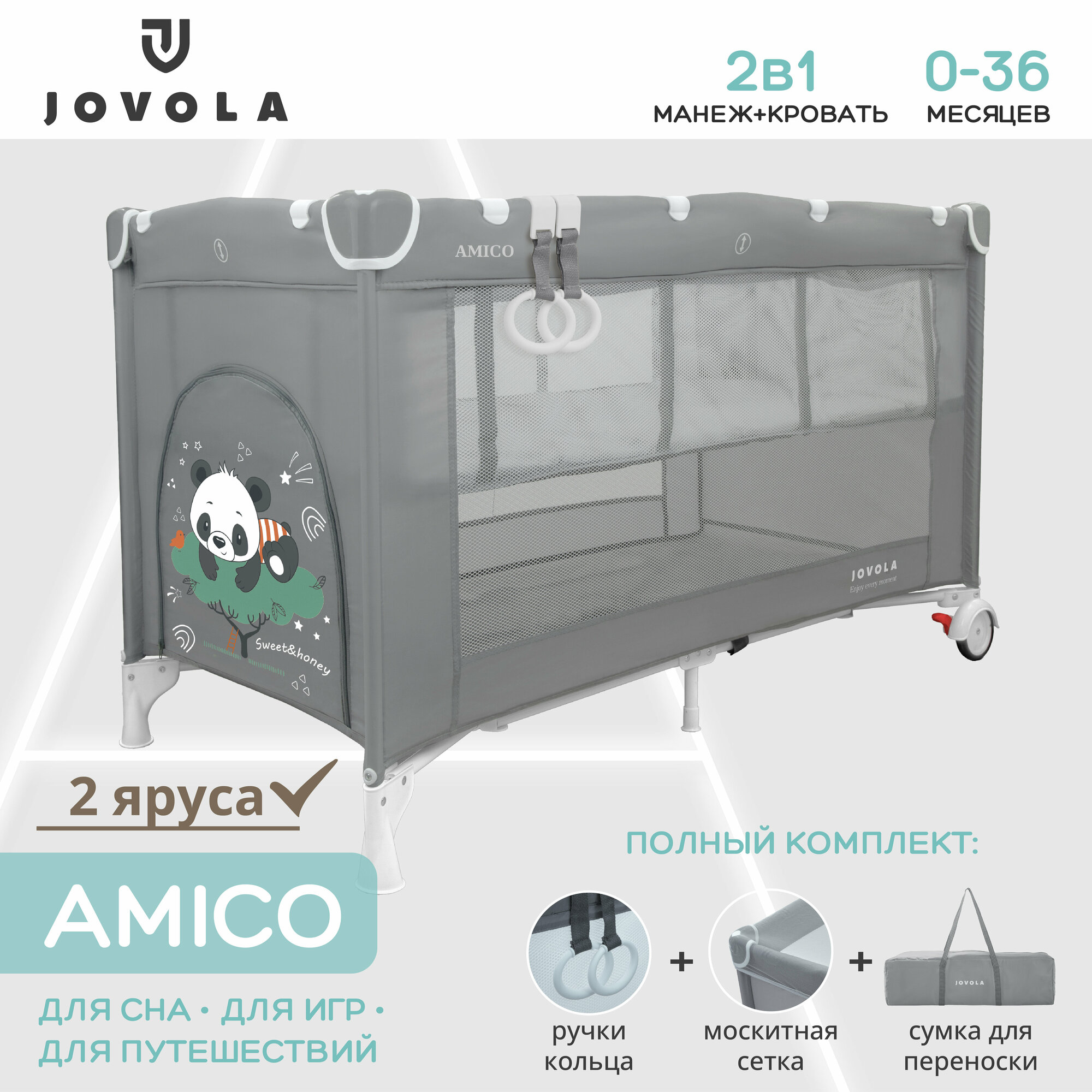 Купить Манеж-кровать JOVOLA AMICO, 0-36 мес, складной, с аксессуарами, 2 уровня, серый