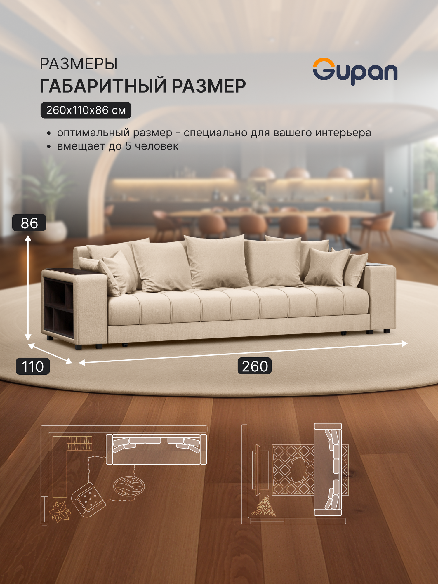 Диван кровать Gupan Дубай Велюр Amigo Beige, раскладной, механизм еврокнижка, беспружинный, с ящиком для белья