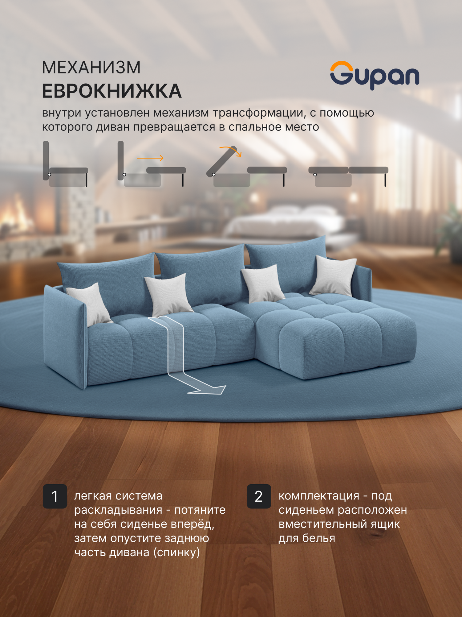 СохранитьДиван угловой Gupan Лагуна Велюр Amigo Blue, раскладной, механизм еврокнижка, беспружинный, с ящиком для белья интересное: