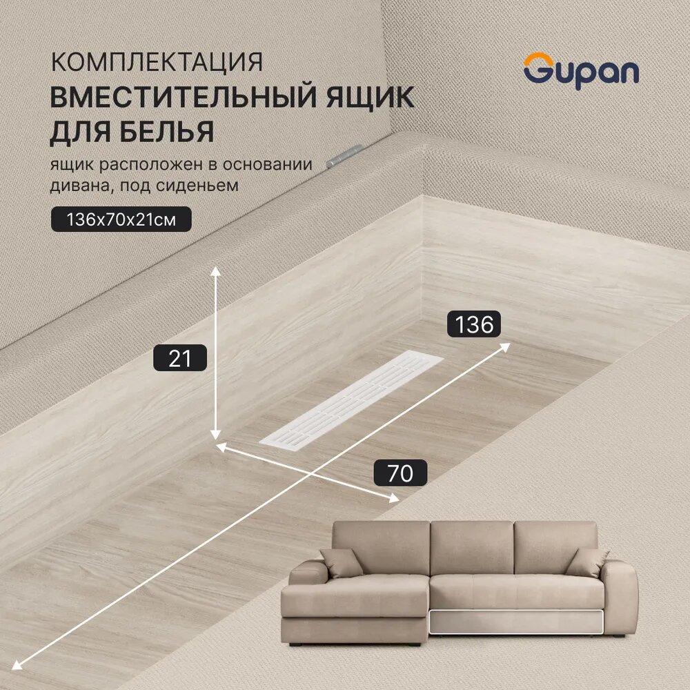 Диван угловой Gupan Элион / Коста Велюр Amigo Beige, раскладной, механизм еврокнижка, беспружинный, с ящиком для белья