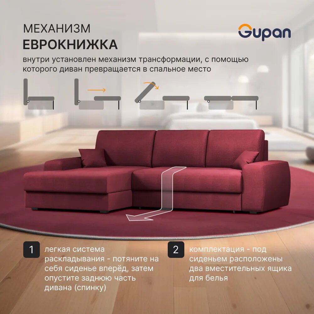 Диван угловой Gupan Элион / Коста Велюр Amigo Berry, раскладной, механизм еврокнижка, беспружинный, с ящиком для белья