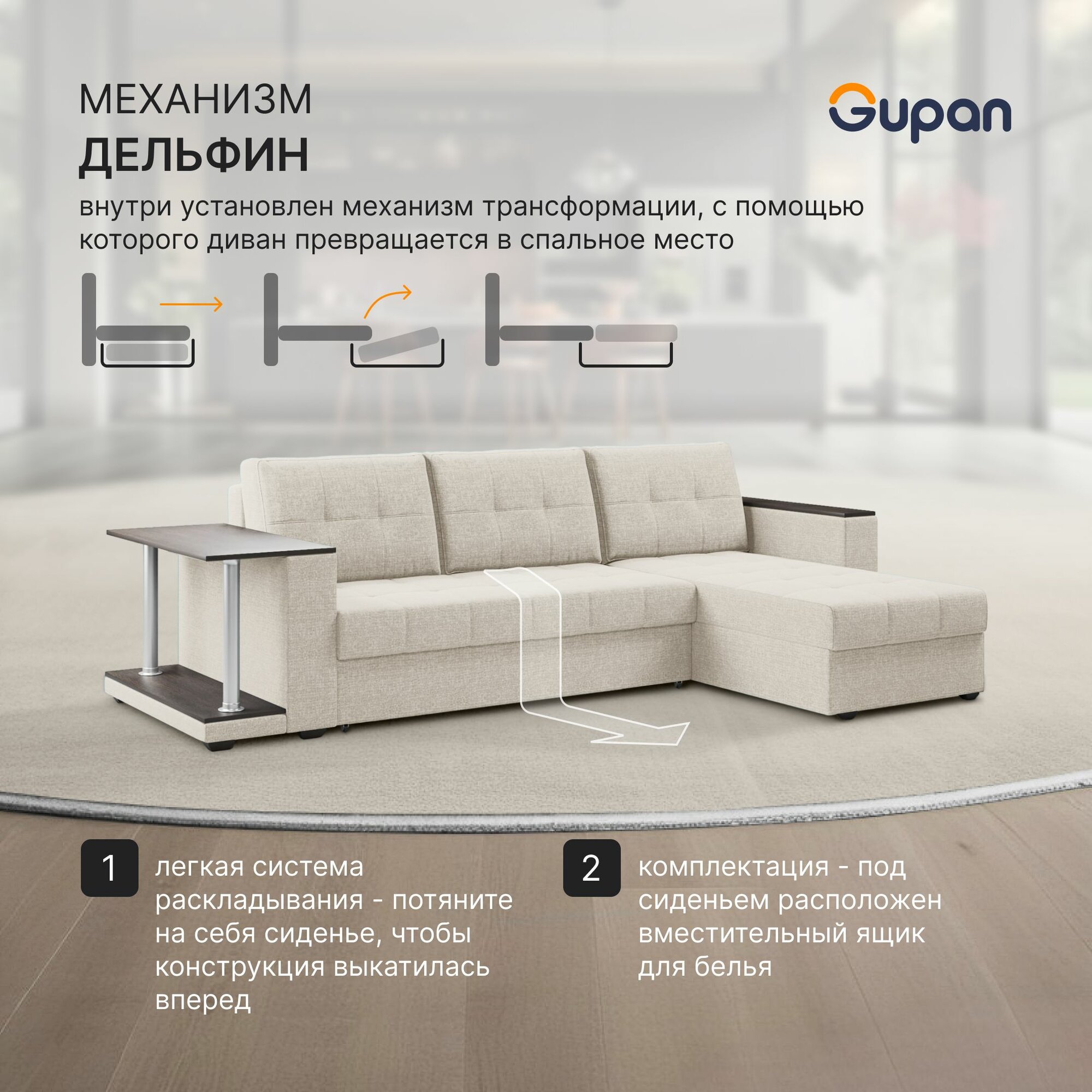 Диван угловой Gupan Атланта Классик Хит / Люкс со столом Рогожка Beige, раскладной, механизм дельфин, беспружинный, с ящиком для белья