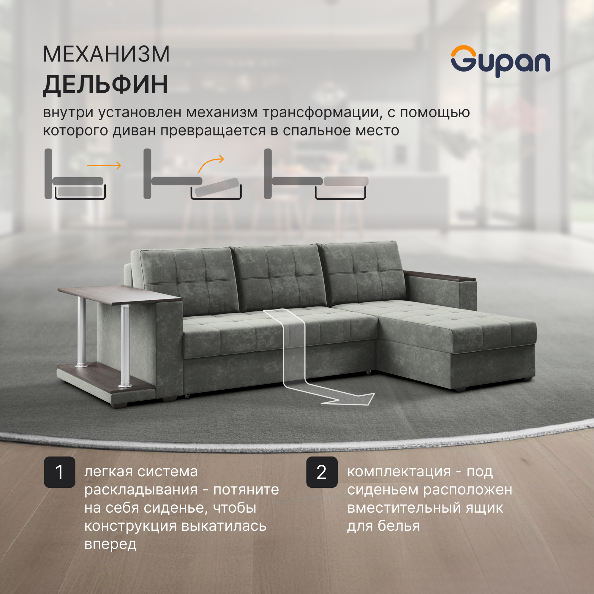Диван угловой Gupan Атланта Классик Хит / Люкс со столом Велюр Bingo Slate, раскладной, механизм дельфин, беспружинный, с ящиком для белья