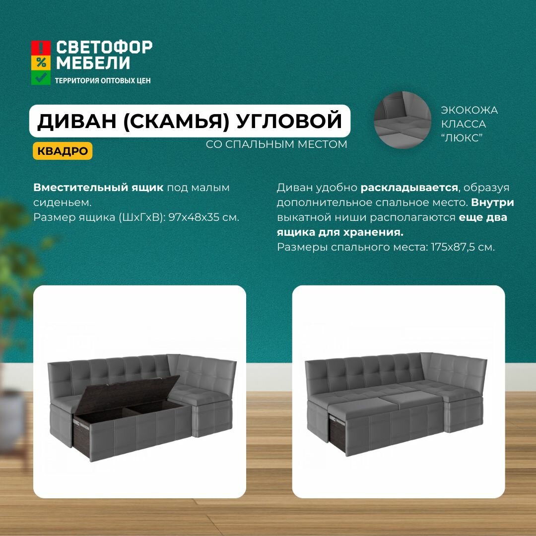 Угловой диван со спальным местом Квадро, Экокожа серая, ЛДСП, выкатной, с ящиком для хранения, 1910х820х1180 бонмебель