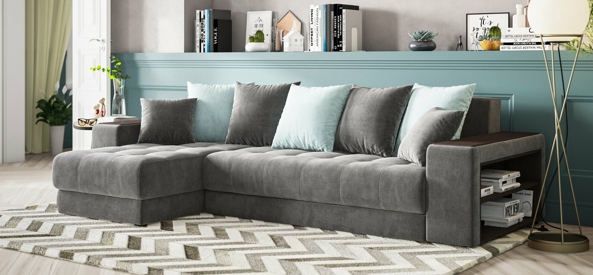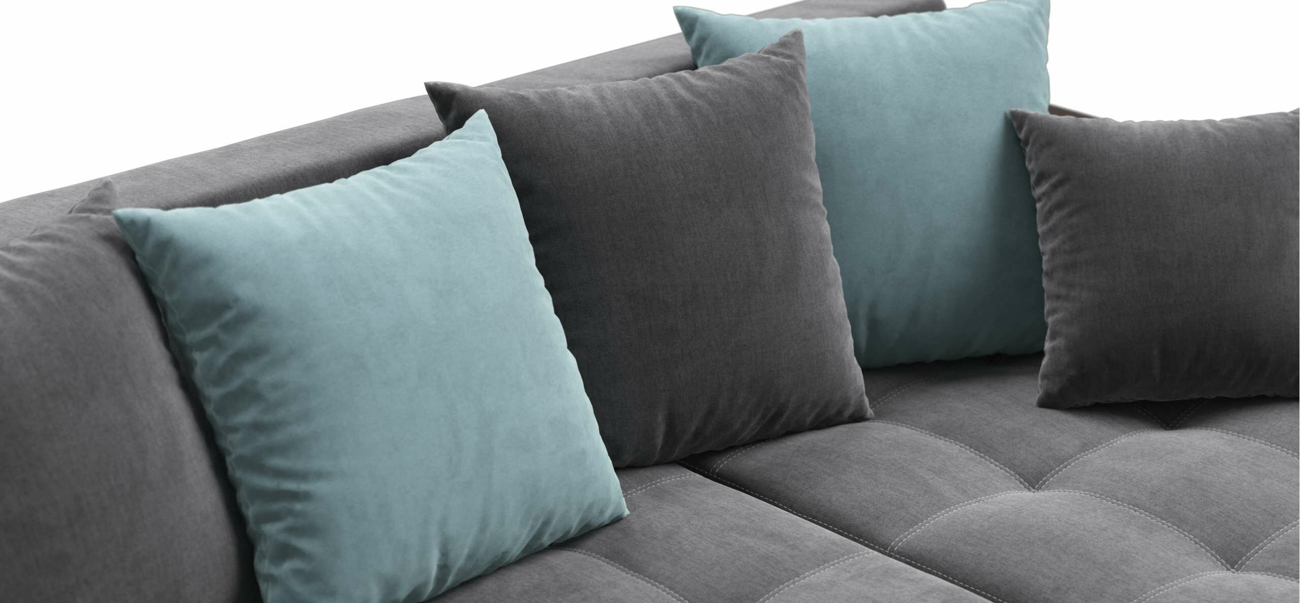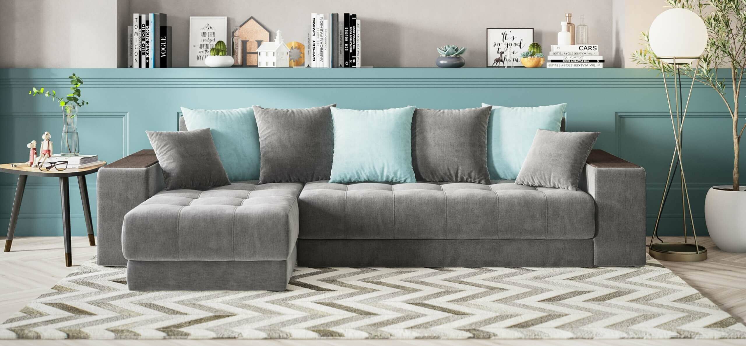 Угловой диван Много мебели Дубай 3.0, велюр Monolit серый/аква, 300x155x87 см