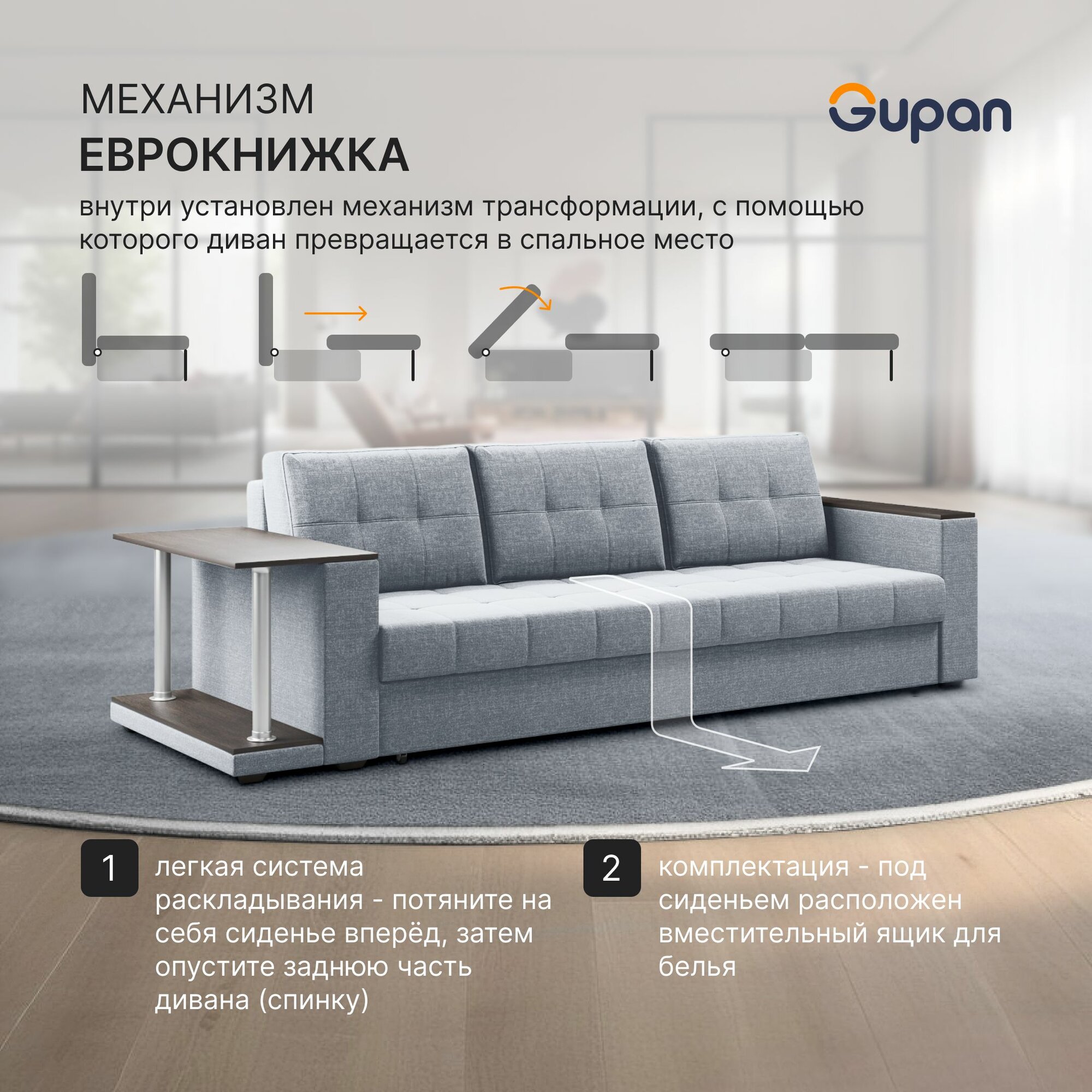 Диван кровать Gupan Атланта Классик Люкс со столом Рогожка Savana Denim, раскладной, механизм еврокнижка, беспружинный, с ящиком для белья