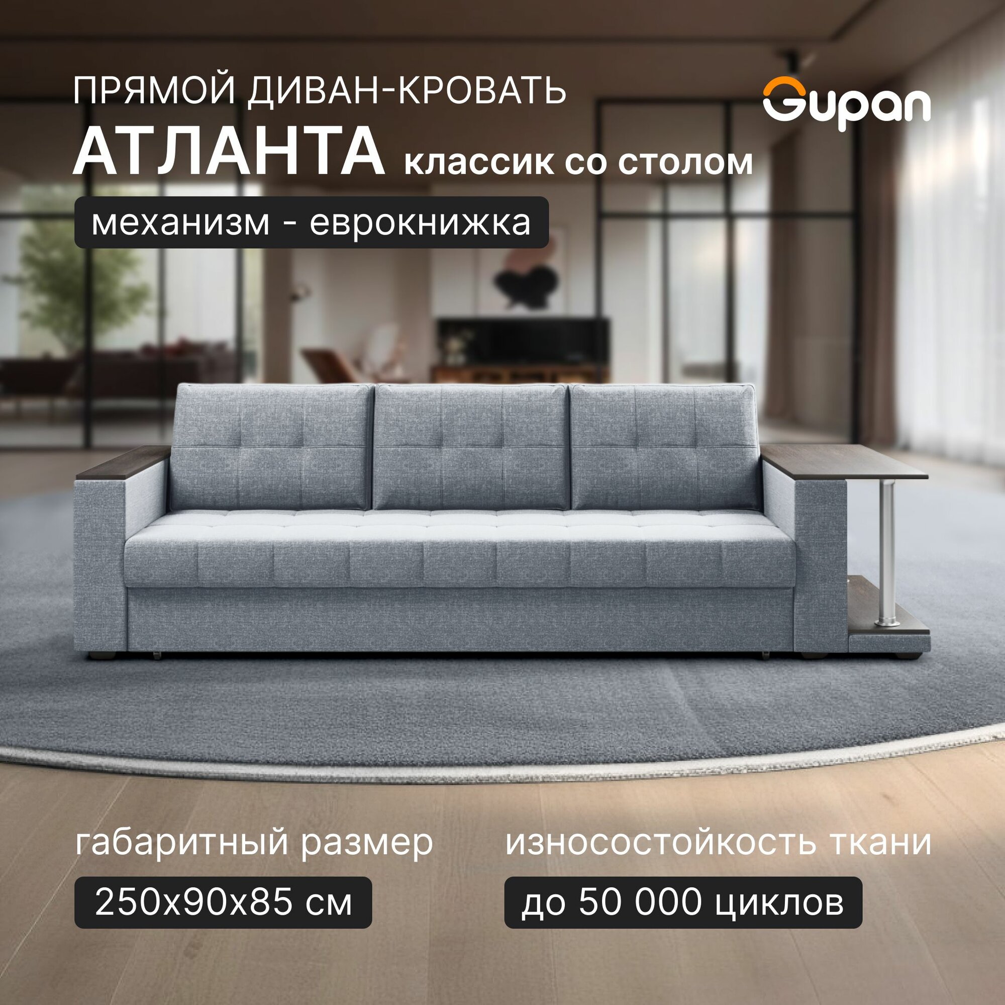 Диван кровать Gupan Атланта Классик Люкс со столом Рогожка Savana Ash, раскладной, механизм еврокнижка, беспружинный, с ящиком для белья