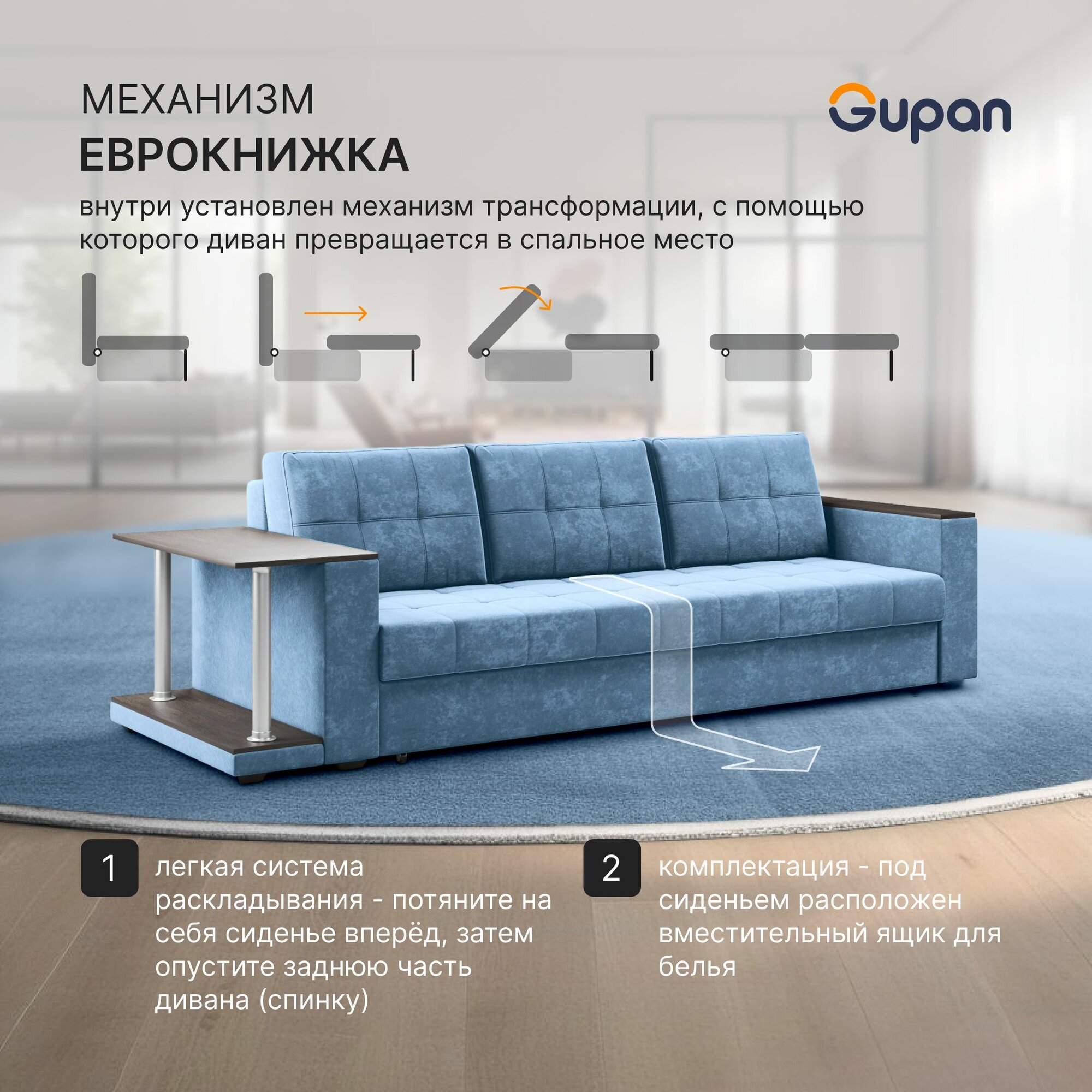 Диван кровать Gupan Атланта Классик Люкс со столом, Велюр Bingo Denim, раскладной, механизм еврокнижка, беспружинный, с ящиком для белья