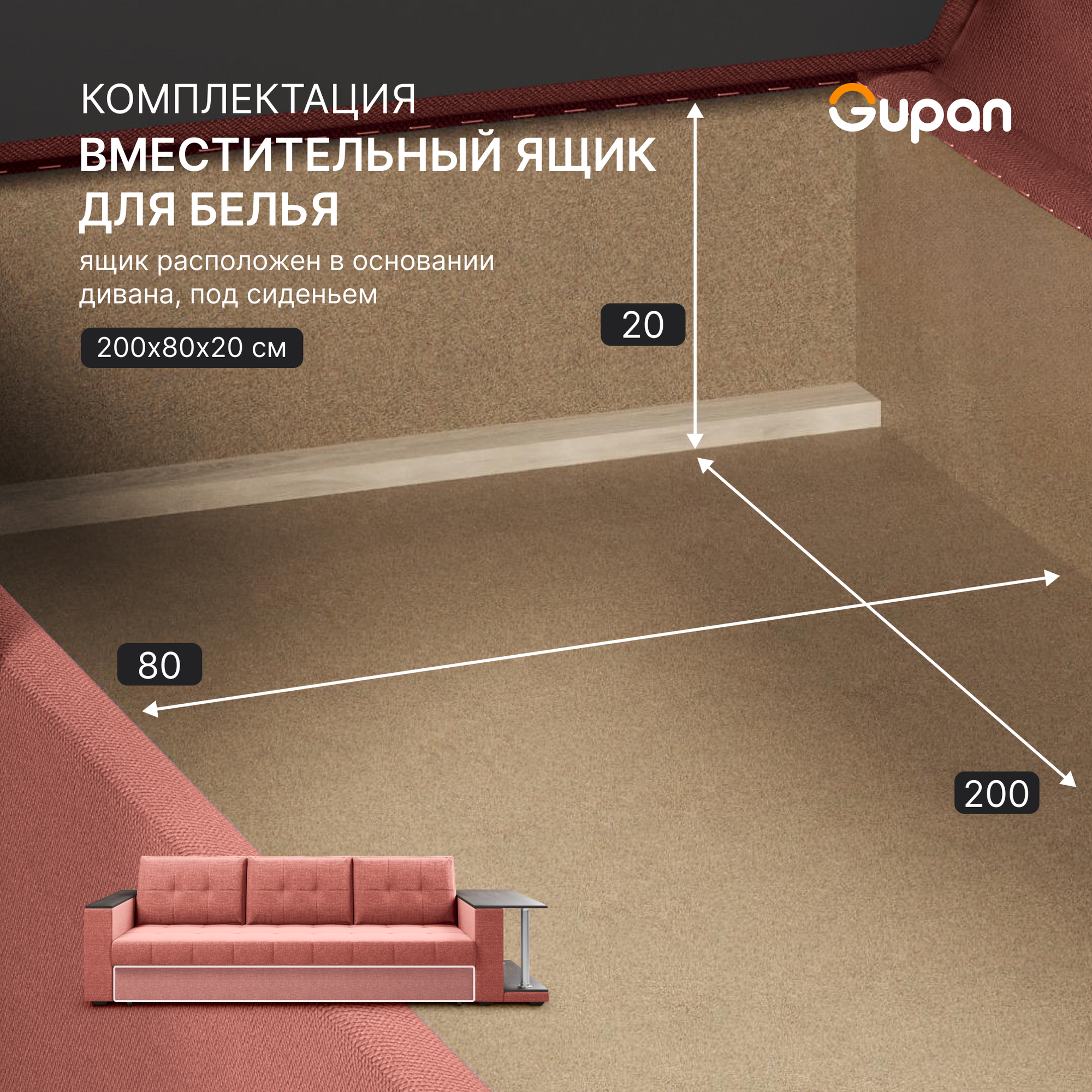 Диван кровать Gupan Атланта Классик Люкс со столом, Велюр Bingo Desert, раскладной, механизм еврокнижка, беспружинный, с ящиком для белья