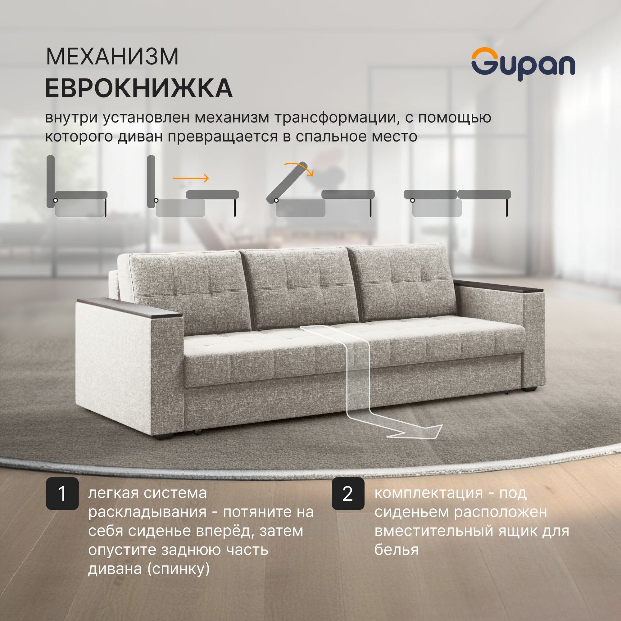Диван кровать Gupan Атланта Классик Люкс Рогожка Beige, раскладной, механизм еврокнижка, беспружинный, с ящиком для белья