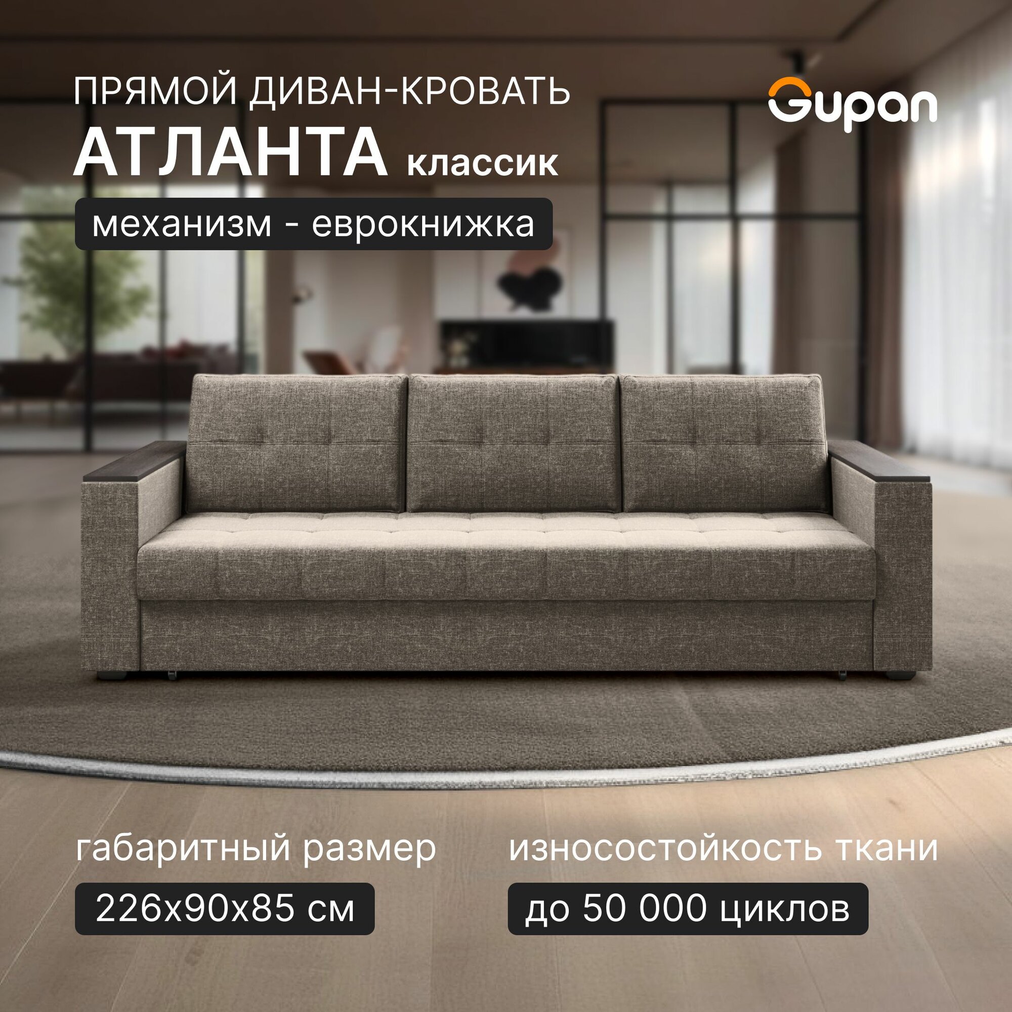 Диван кровать Gupan Атланта Классик Люкс, Рогожка Savana Mouse, раскладной, механизм еврокнижка, беспружинный, с ящиком для белья