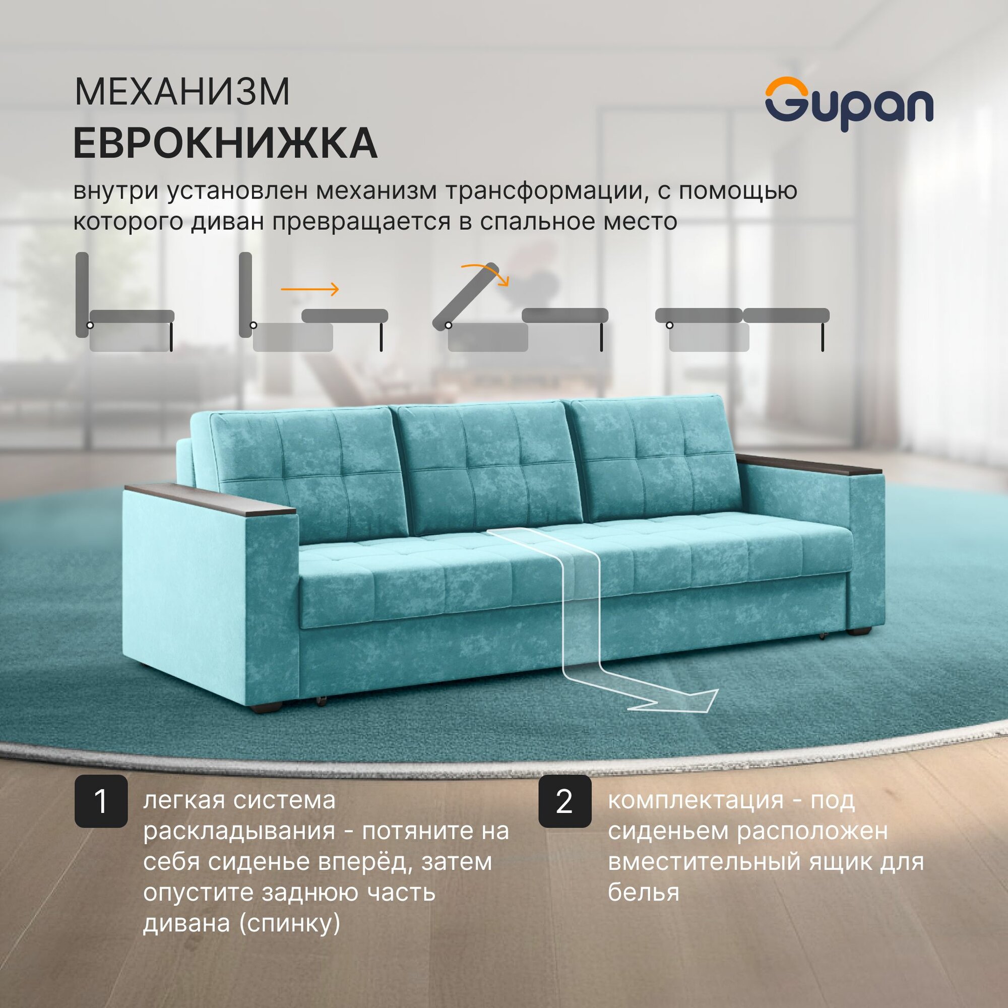 Диван кровать Gupan Алекс Велюр Amigo Lagoon, раскладной, механизм выкатной, беспружинный, с ящиком для белья